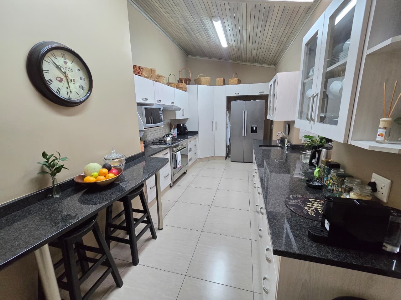 -Large modern kitchen fitted with granite countertops, ample built-in cupboards, pantry, and separate scullery