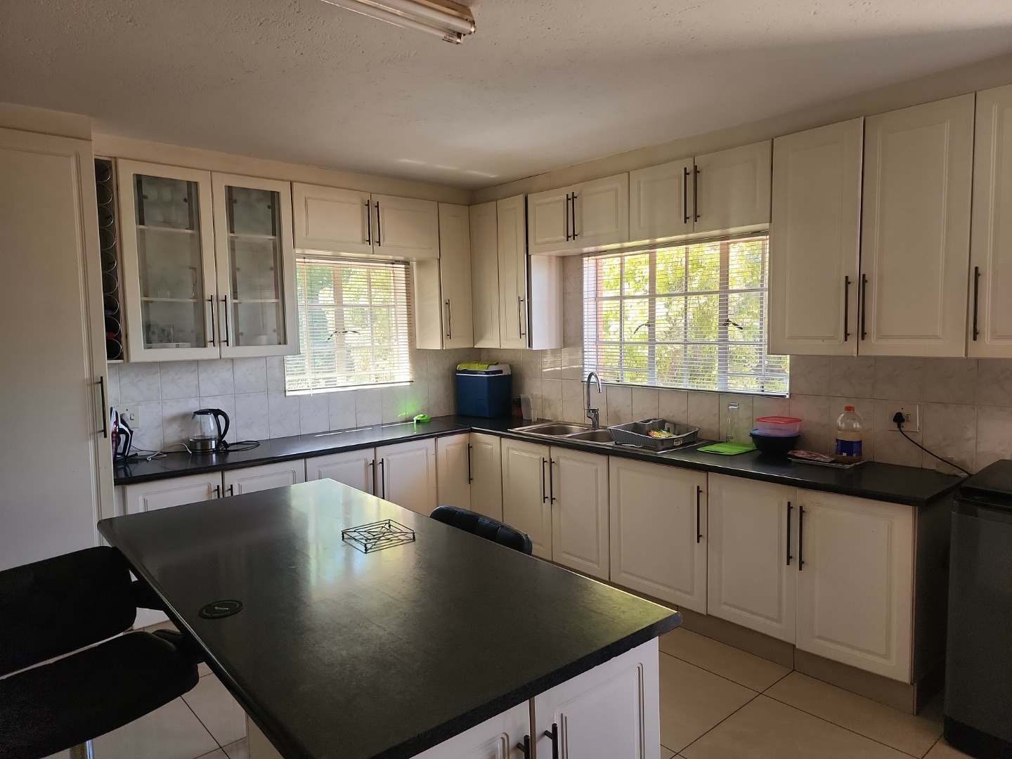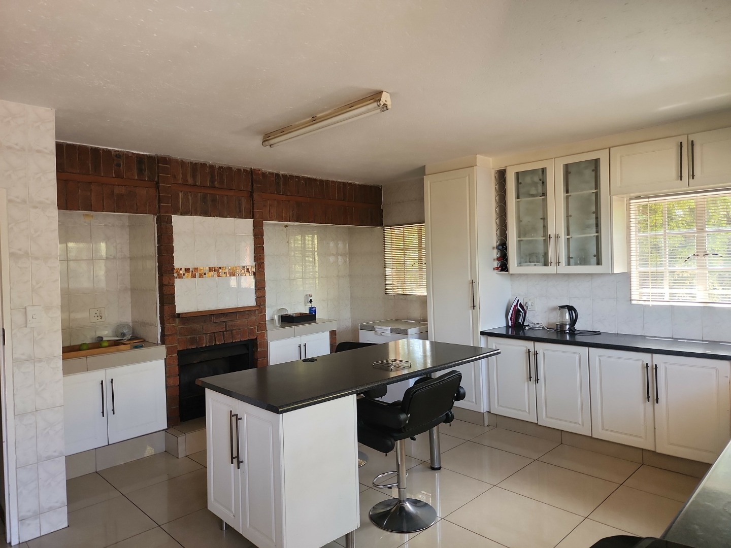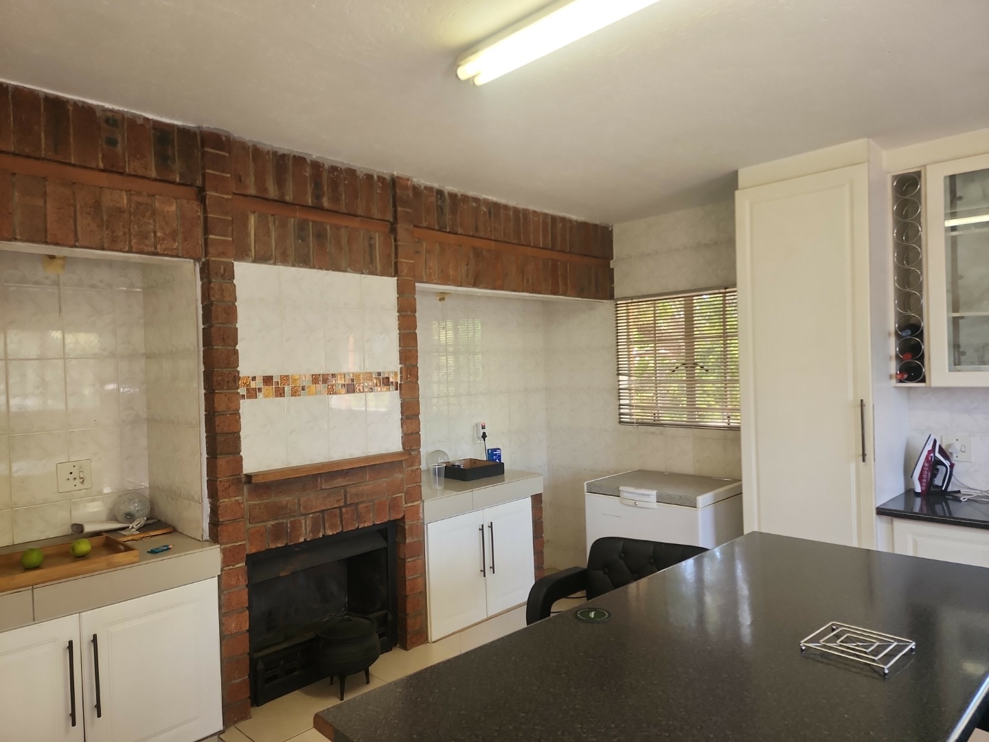 The modern kitchen is a highlight, boasting extensive white cabinetry, dark counter-tops, and a large central island with seating. It is well-equipped with an integrated gas stove, oven, and extractor fan, alongside a double sink and a built-in wine rack. A unique built-in braai/fireplace feature adds character and functionality, perfect for entertaining.