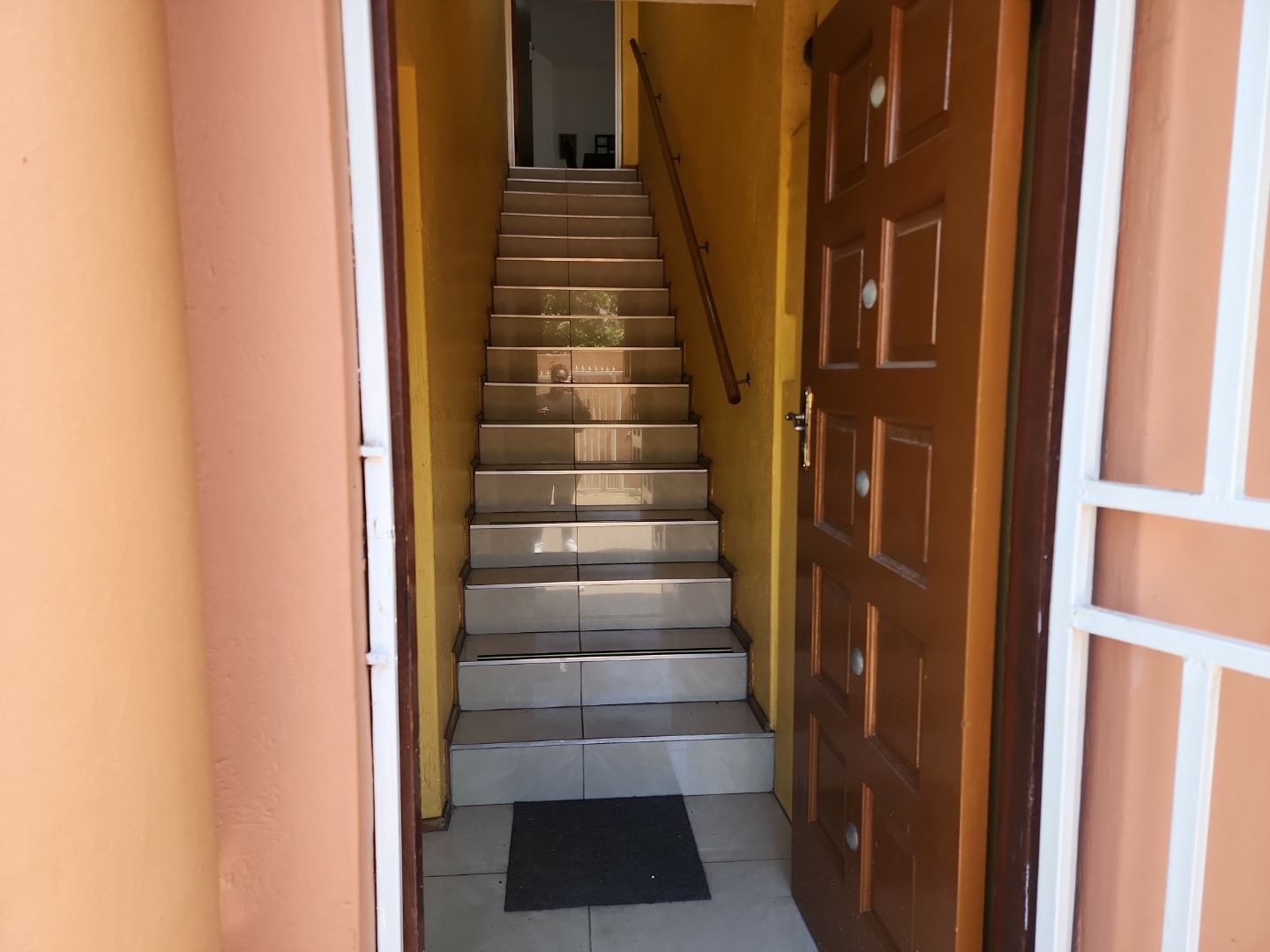 Step inside to an entryway with a tiled staircase and a visible security gate, leading to the spacious open-plan living and dining areas. These versatile spaces are illuminated by ample natural light from large windows and feature recessed ceiling lights, creating a bright and welcoming atmosphere. The durable tiled flooring extends throughout, offering easy maintenance.