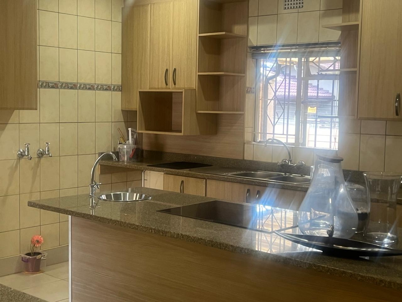 A neatly landscaped entrance leads into spacious living areas, including an inviting lounge, dining room, and a sleek contemporary kitchen.