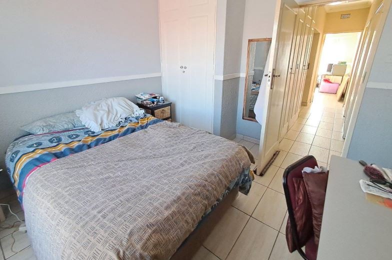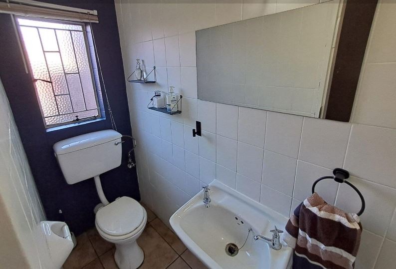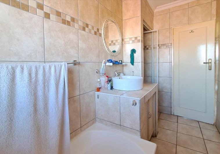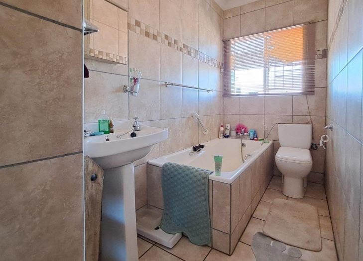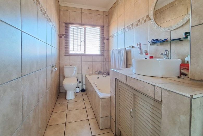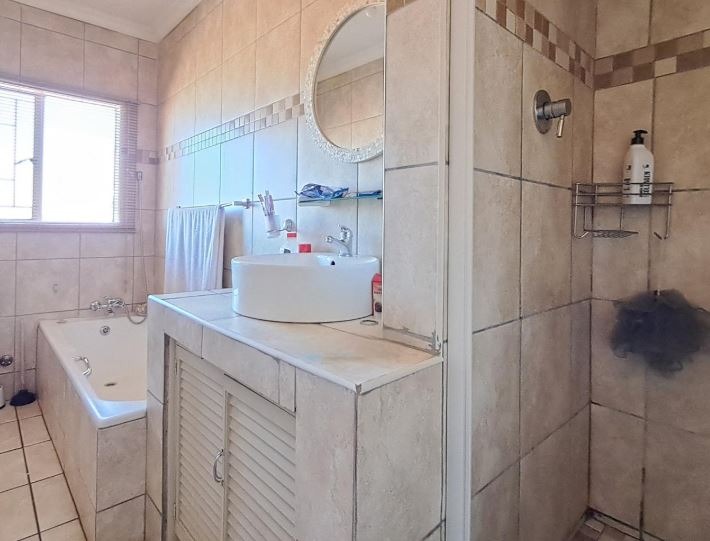 Upstairs features three bedrooms with built in cupboards and two bathrooms, including a full en suite in the main bedroom and a second bathroom with bath, toilet, and basin.