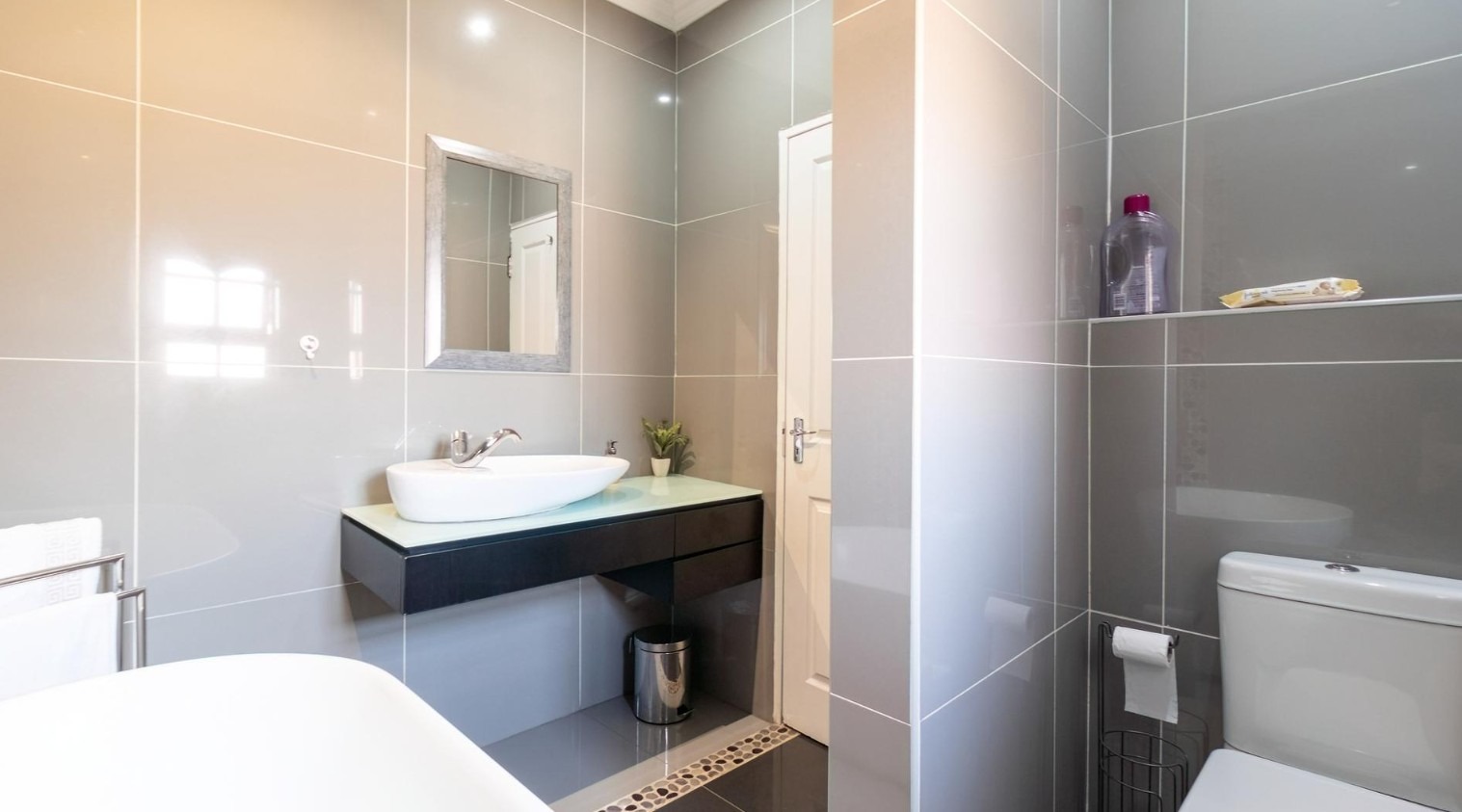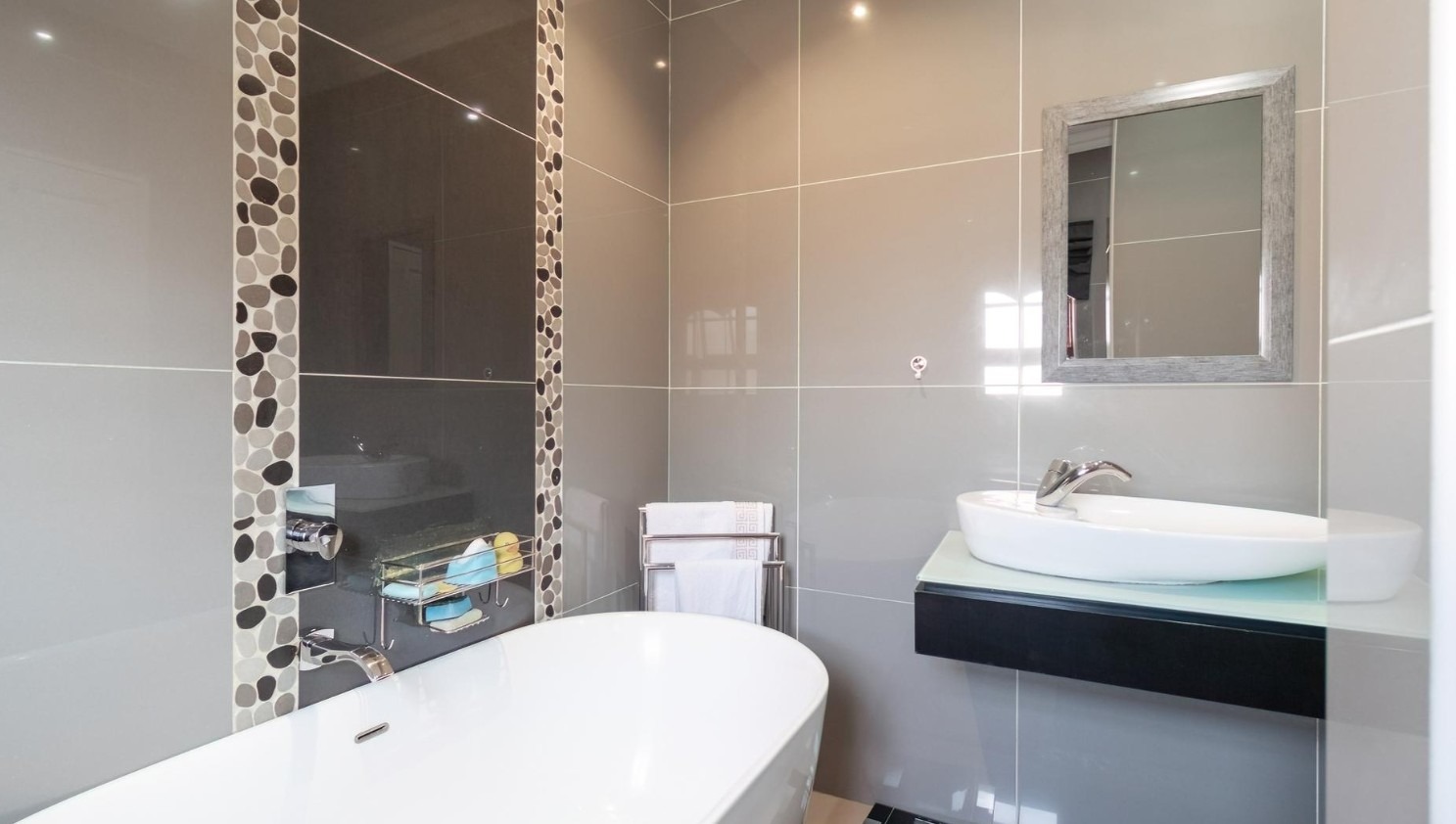 The main bedroom boasts an elegant en-suite bathroom with a relaxing and soaking bathtub, while the other two bedrooms share a neat, well-appointed family bathroom for convenience and space.