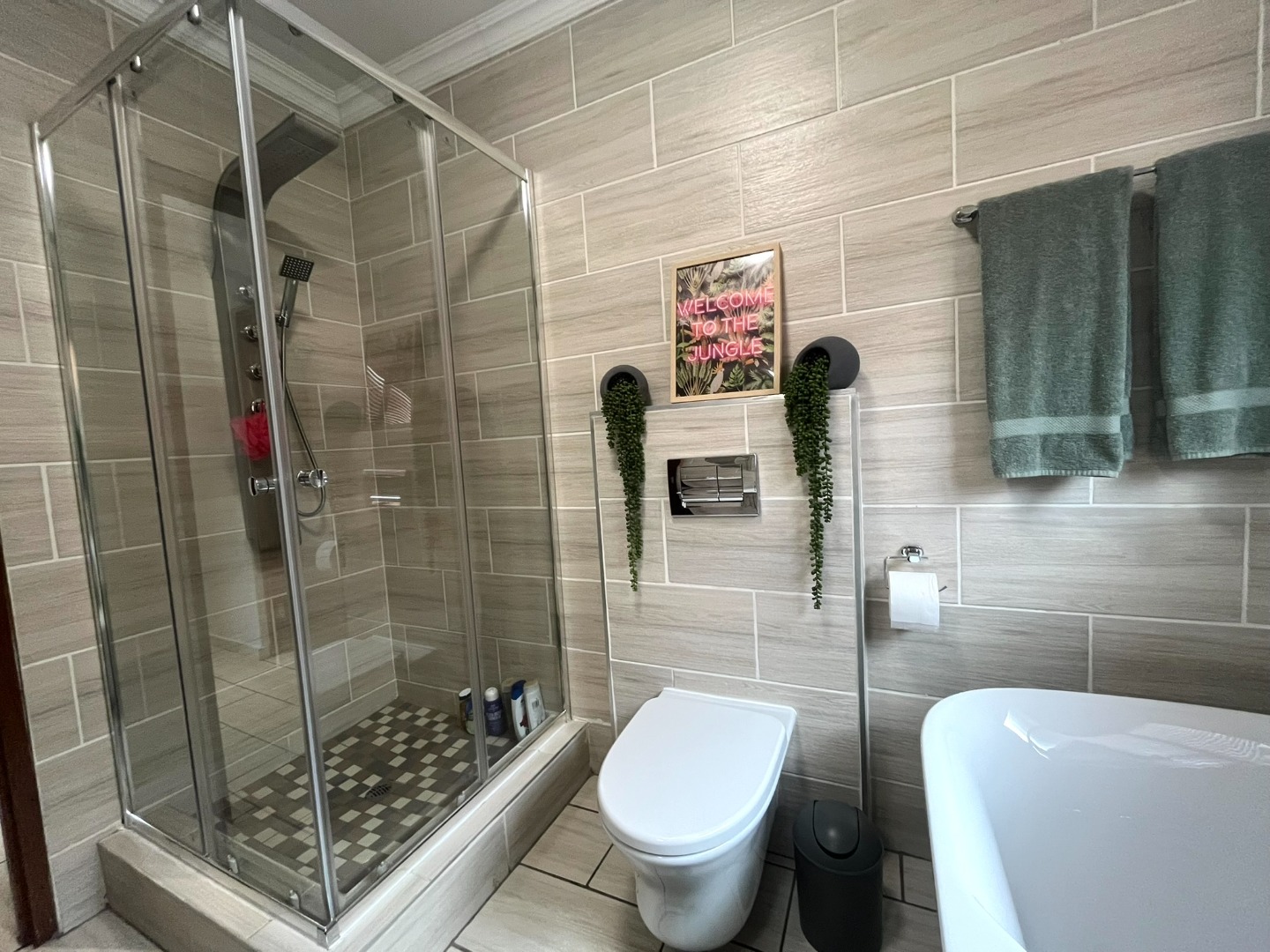 Privacy and convenience flow into the bedroom wing, where you will find three spacious, well-appointed bedrooms. The main bedroom en-suite with a walk in closet is a tranquil retreat with its own air-conditioner and a luxurious full bathroom featuring a freestanding indulgent soaking tub, vanity, refreshing shower, and toilet — the perfect way to unwind. A second stylish full bathroom serves the remaining two bedrooms, both capturing radiant natural light.