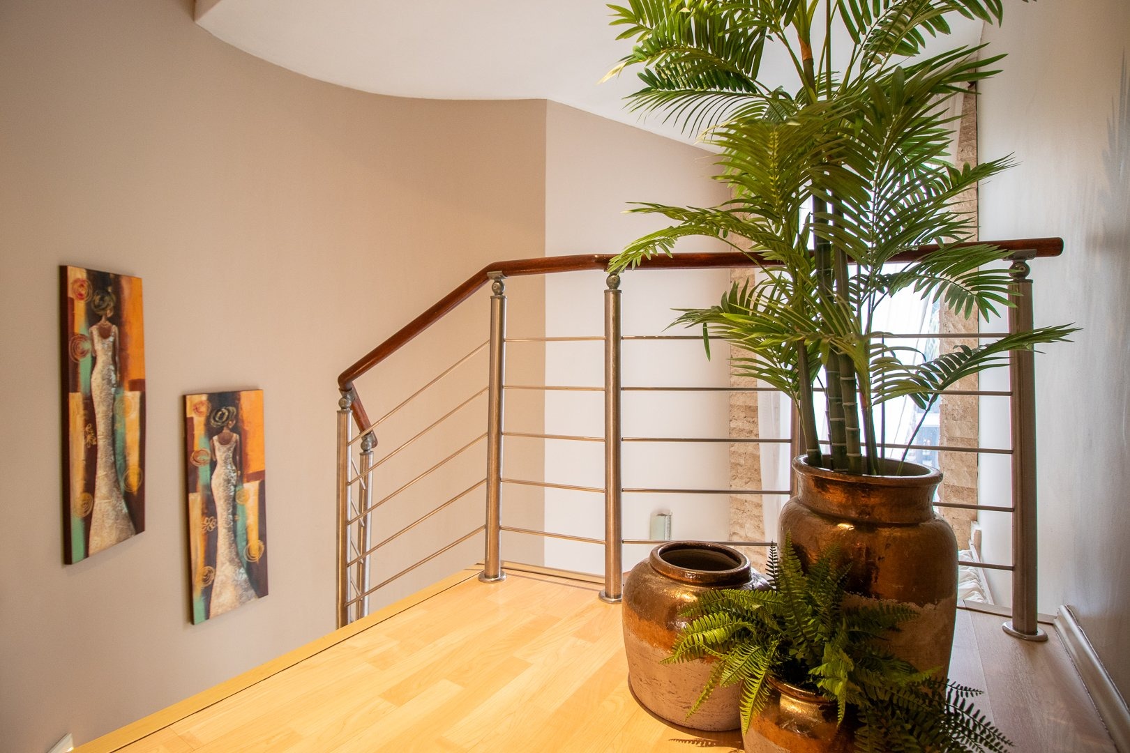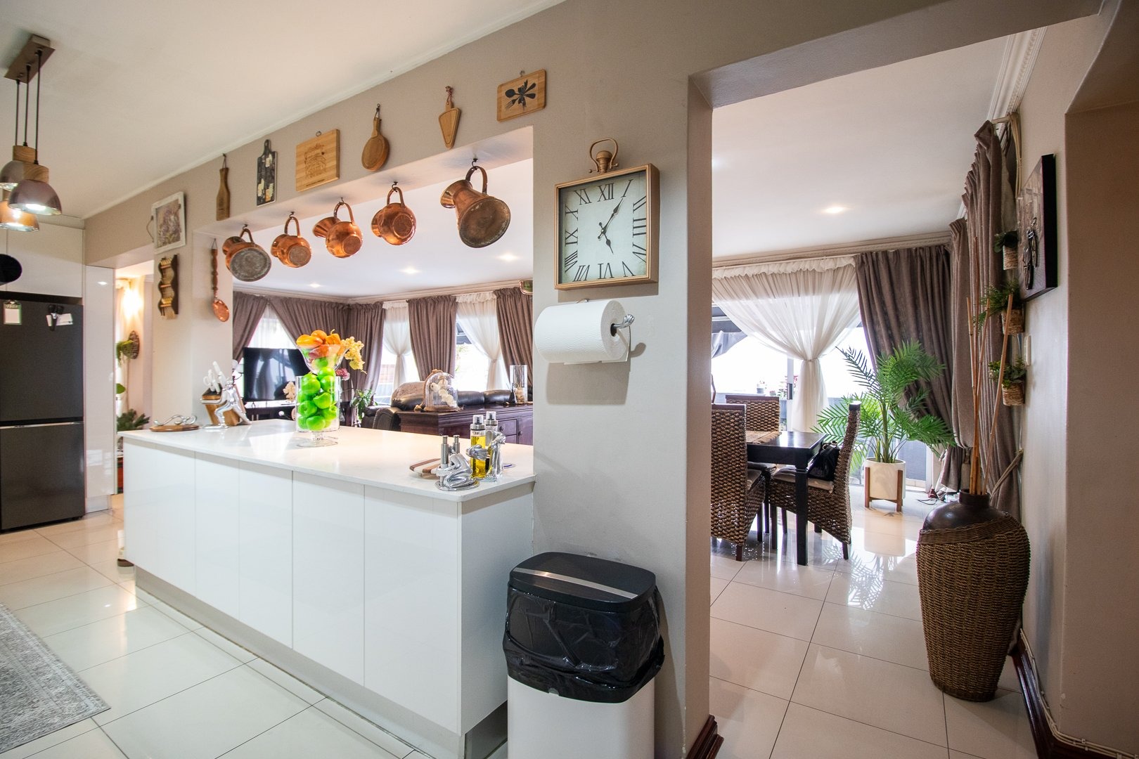 - Sleek White Tiled Floors and High Ceilings