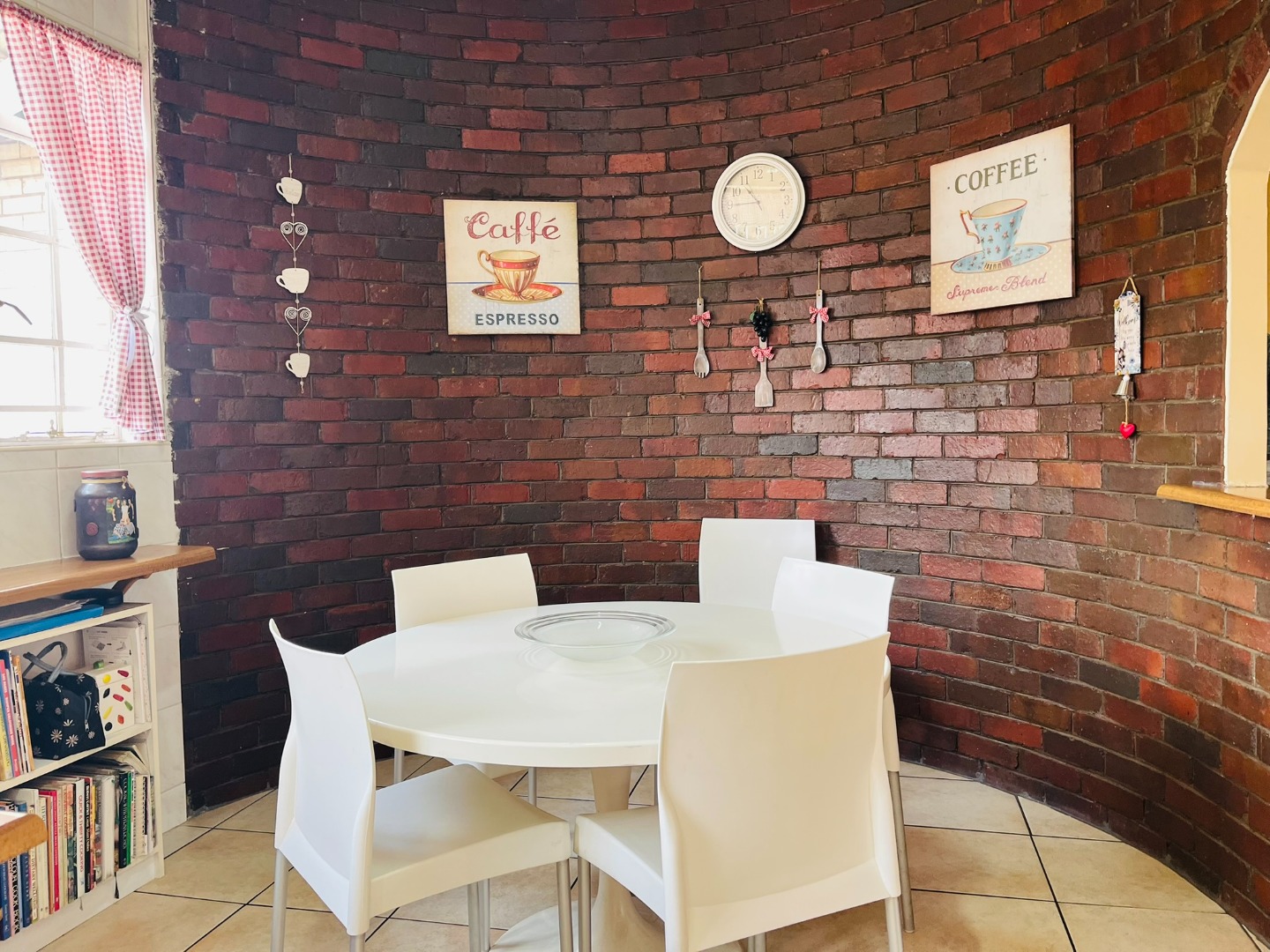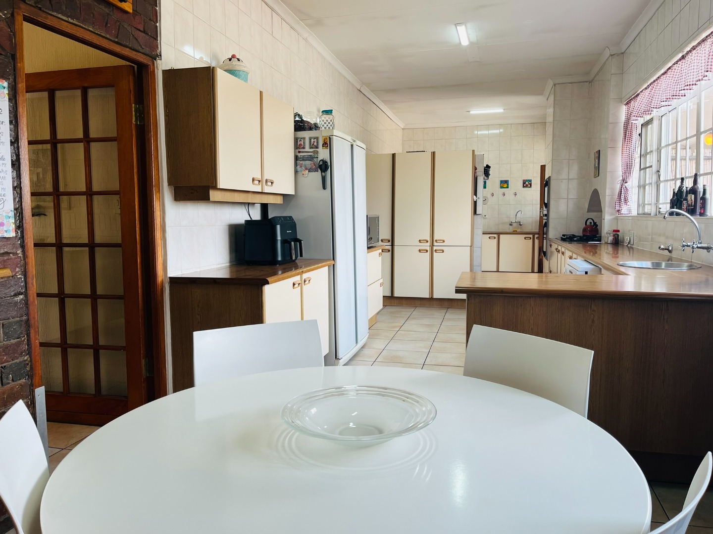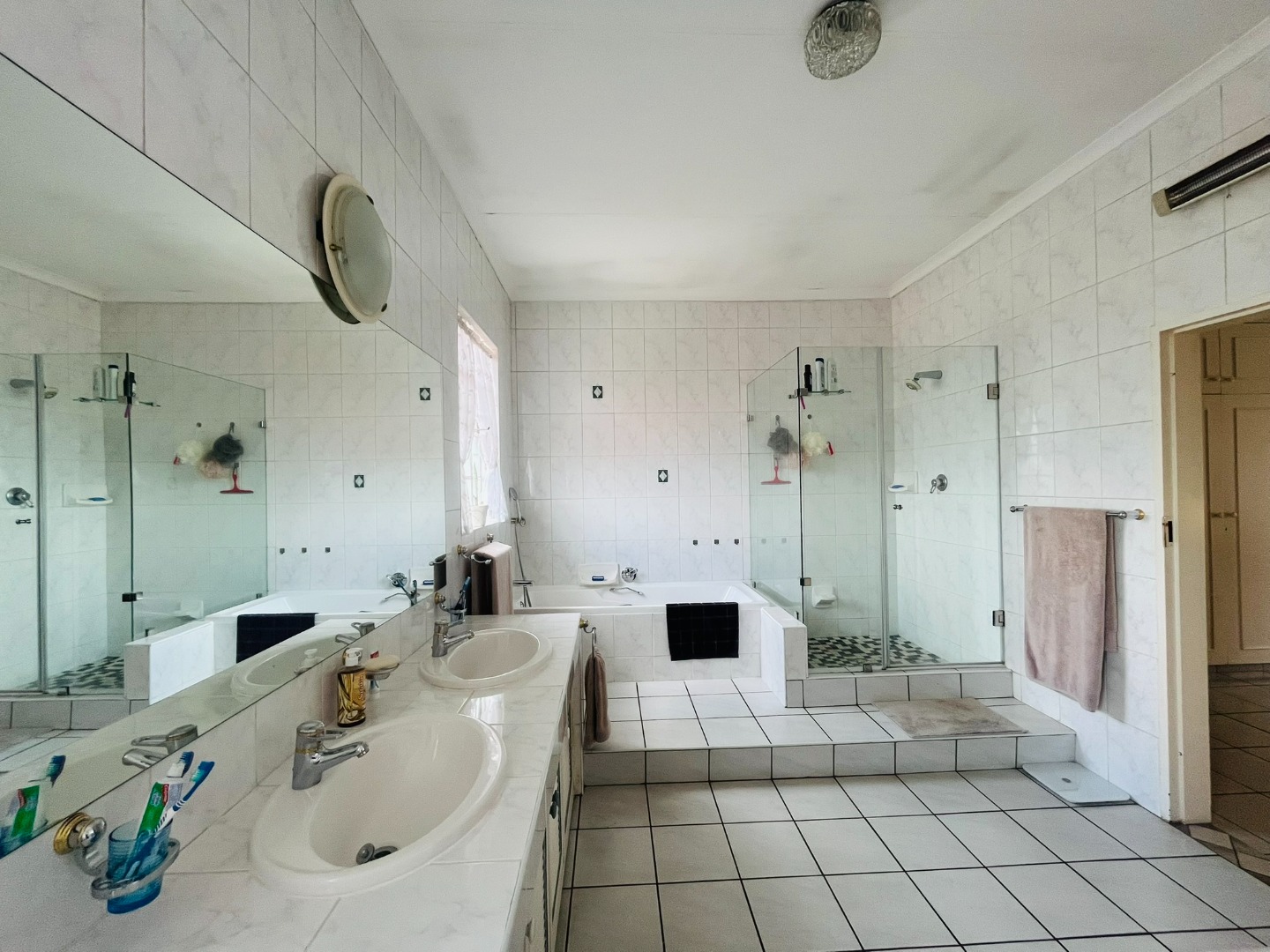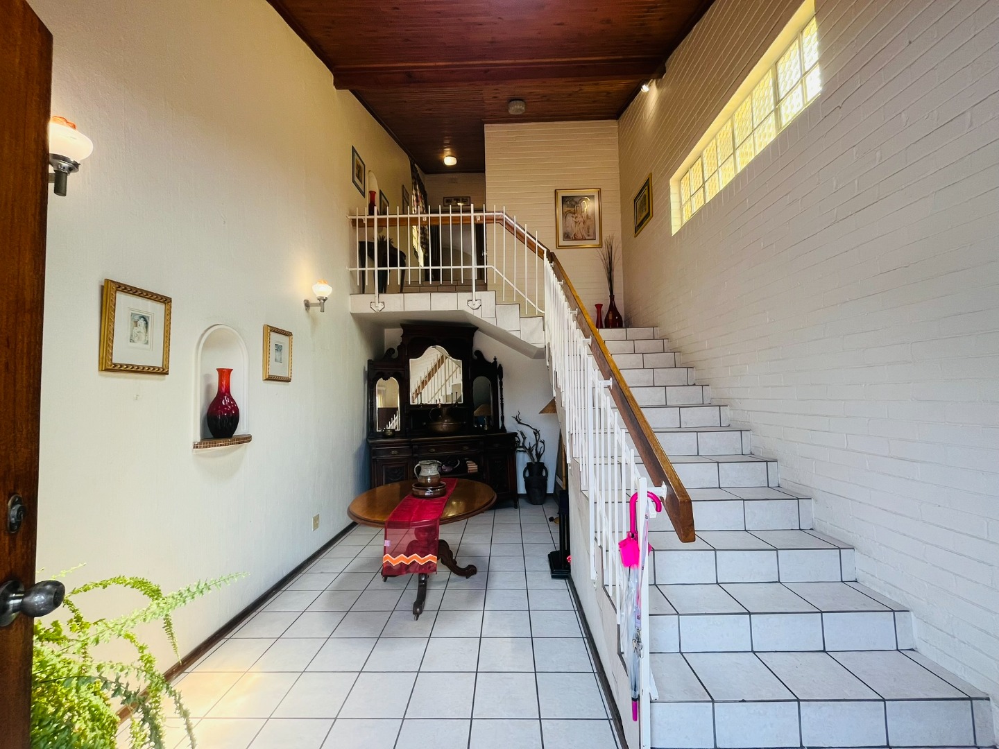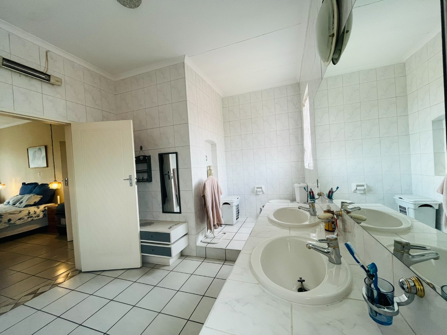 Step through grand double doors into an inviting foyer that sets the tone for the spacious interiors that follow. The main lounge opens through French doors onto a huge patio—perfect for hosting guests or enjoying relaxed alfresco evenings. A second lounge flows seamlessly into the open-plan dining area, also fitted with French doors and blinds, creating a bright and cohesive living space. A cosy pajama lounge offers the ideal spot for quiet family time. A conveniently located guest toilet with a basin completes the ground-floor living amenities.