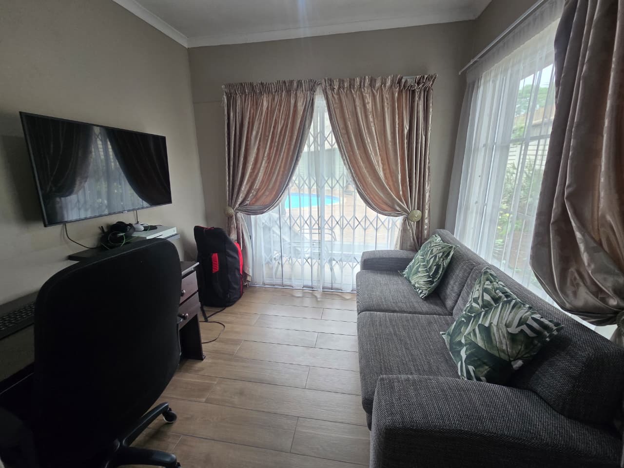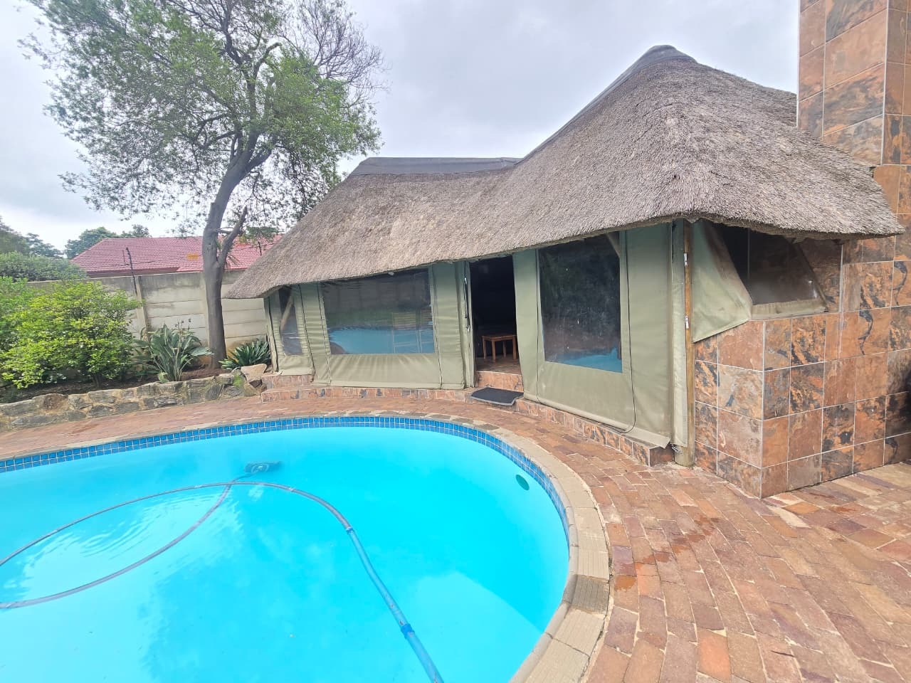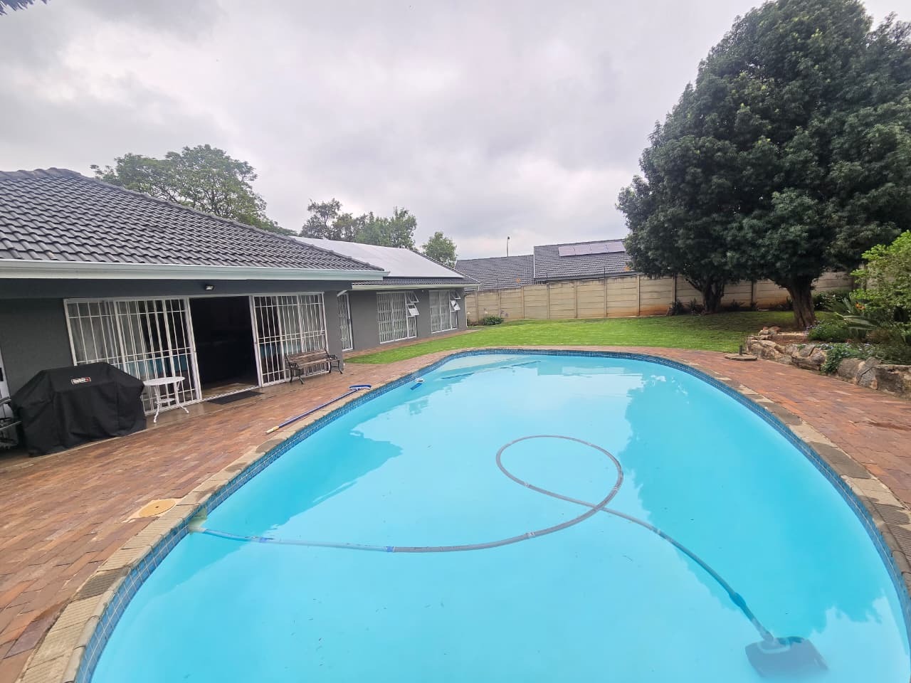 The outdoor lifestyle continues with a sparkling swimming pool, surrounded by an entertainment-friendly patio and a peaceful garden backdrop. This area flows directly into the home’s living spaces, making it perfect for weekend braais, relaxed afternoons or hosting friends and family.