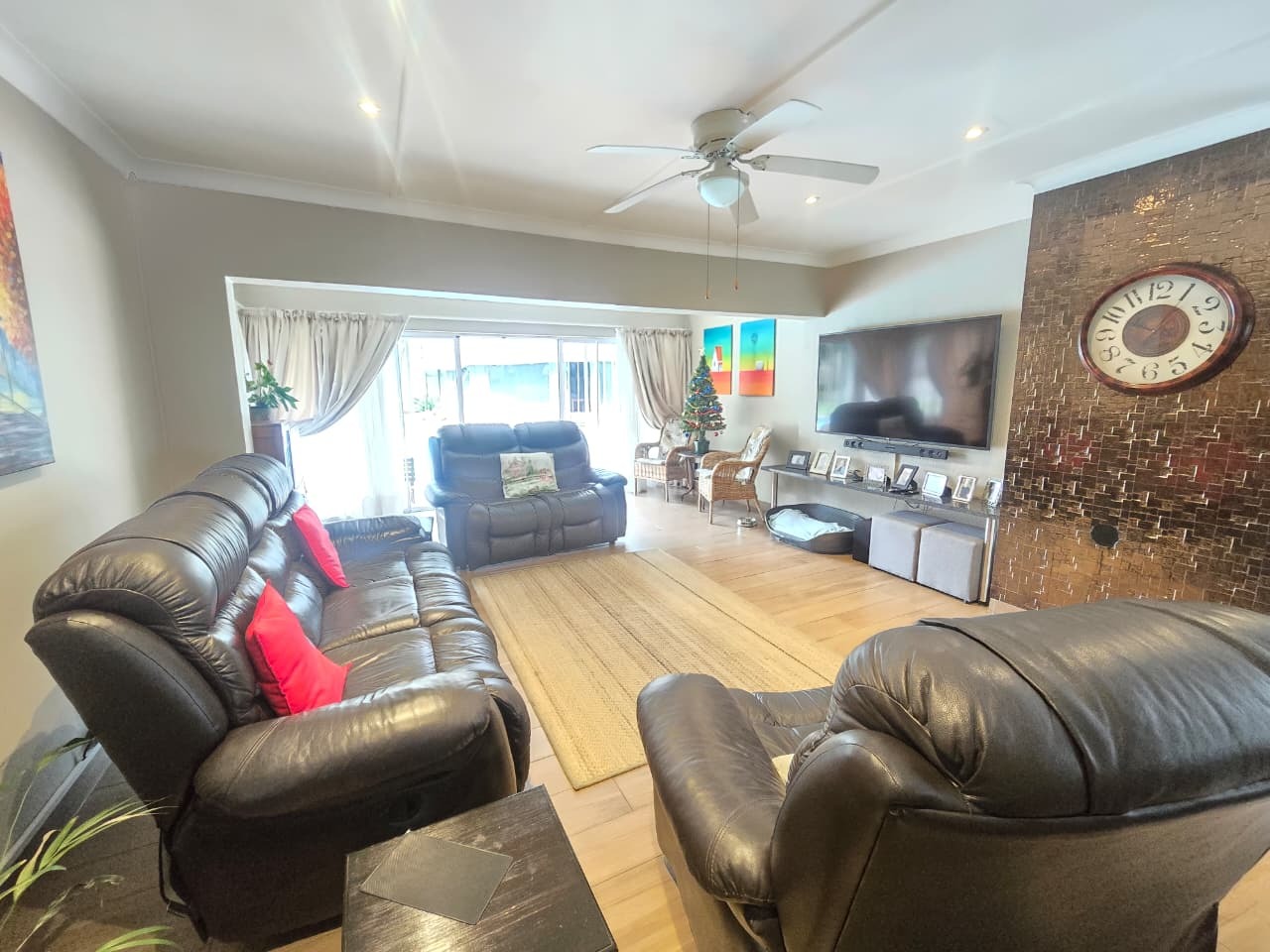 Inside, the home features a warm and functional kitchen with excellent counter space, a breakfast bar and solid cabinetry. It opens into spacious living and dining zones filled with natural light, offering flexibility for family gatherings, work-from-home setups and everyday living. The additional TV/office room overlooks the pool, creating a calm and versatile space for relaxation or productivity.