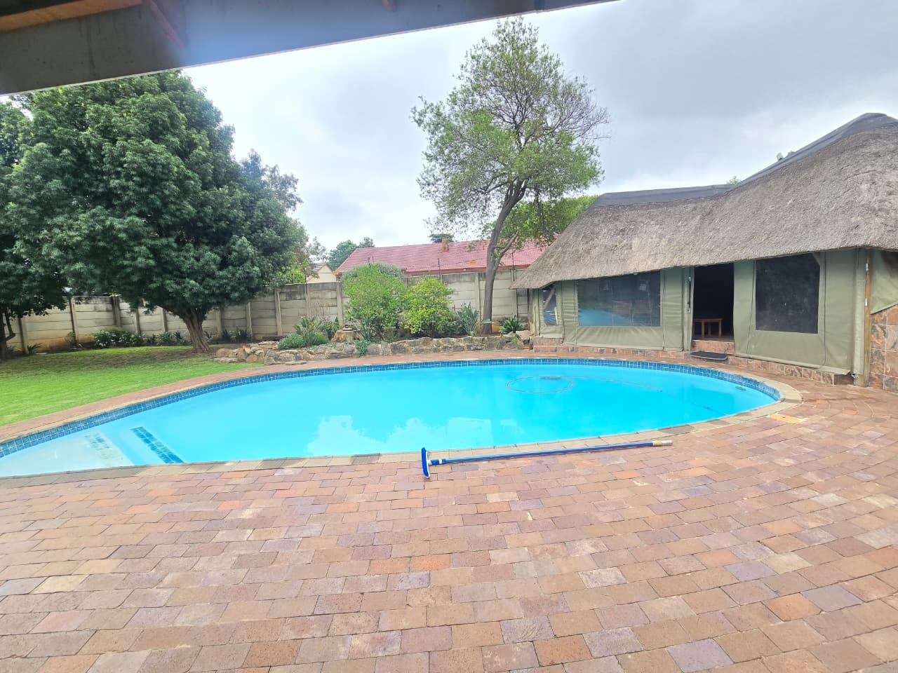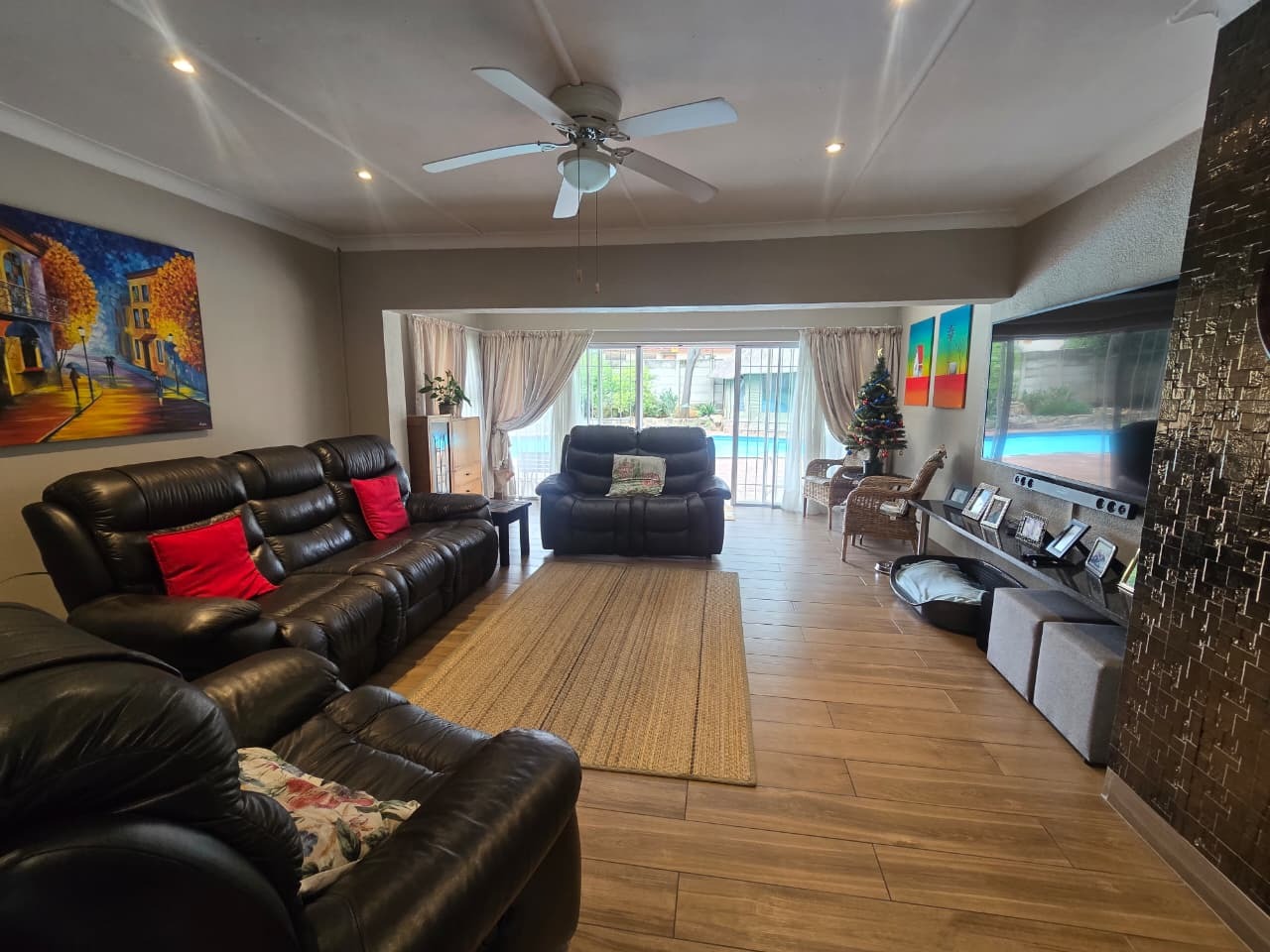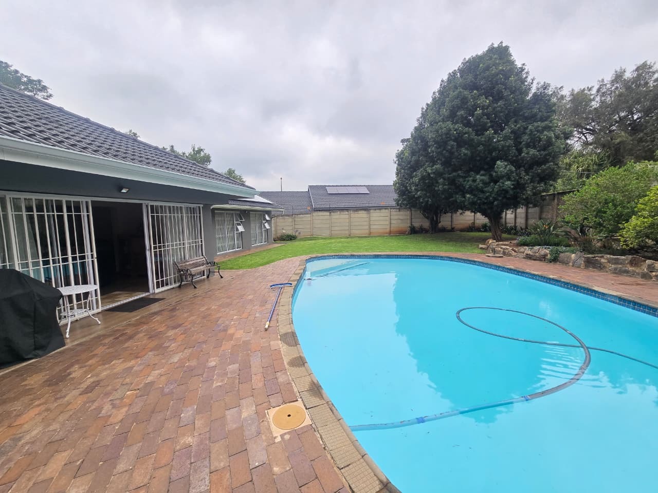 The outdoor lifestyle continues with a sparkling swimming pool, surrounded by an entertainment-friendly patio and a peaceful garden backdrop. This area flows directly into the home’s living spaces, making it perfect for weekend braais, relaxed afternoons or hosting friends and family.