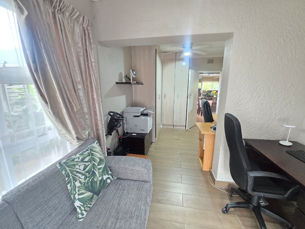 Multiple living rooms including a cozy TV/office space with garden views