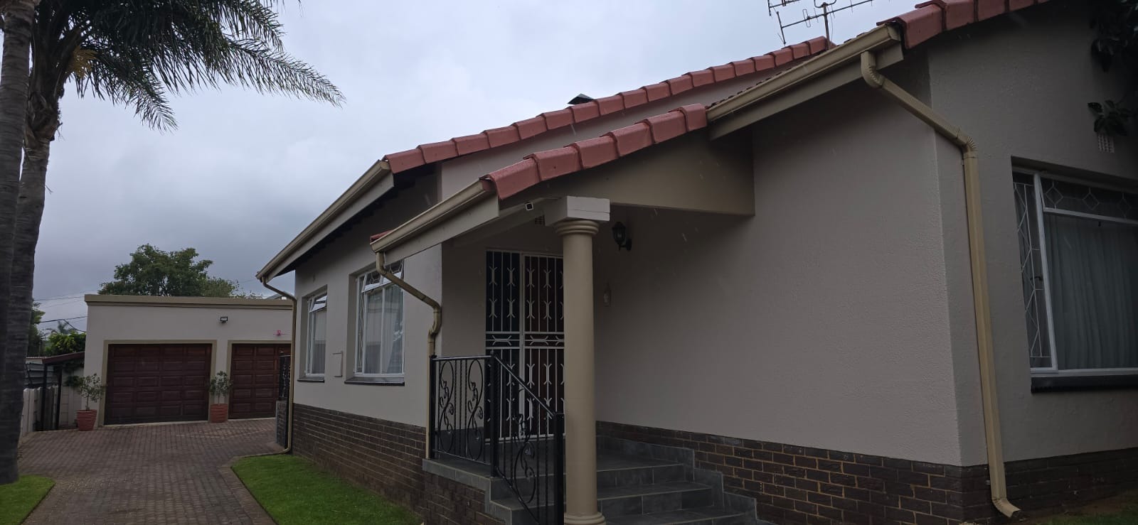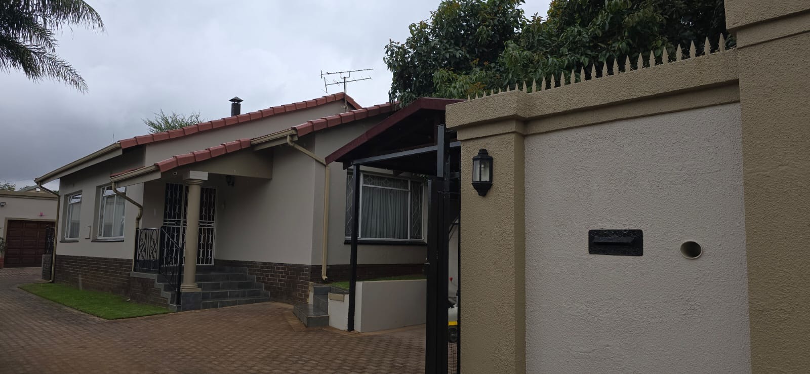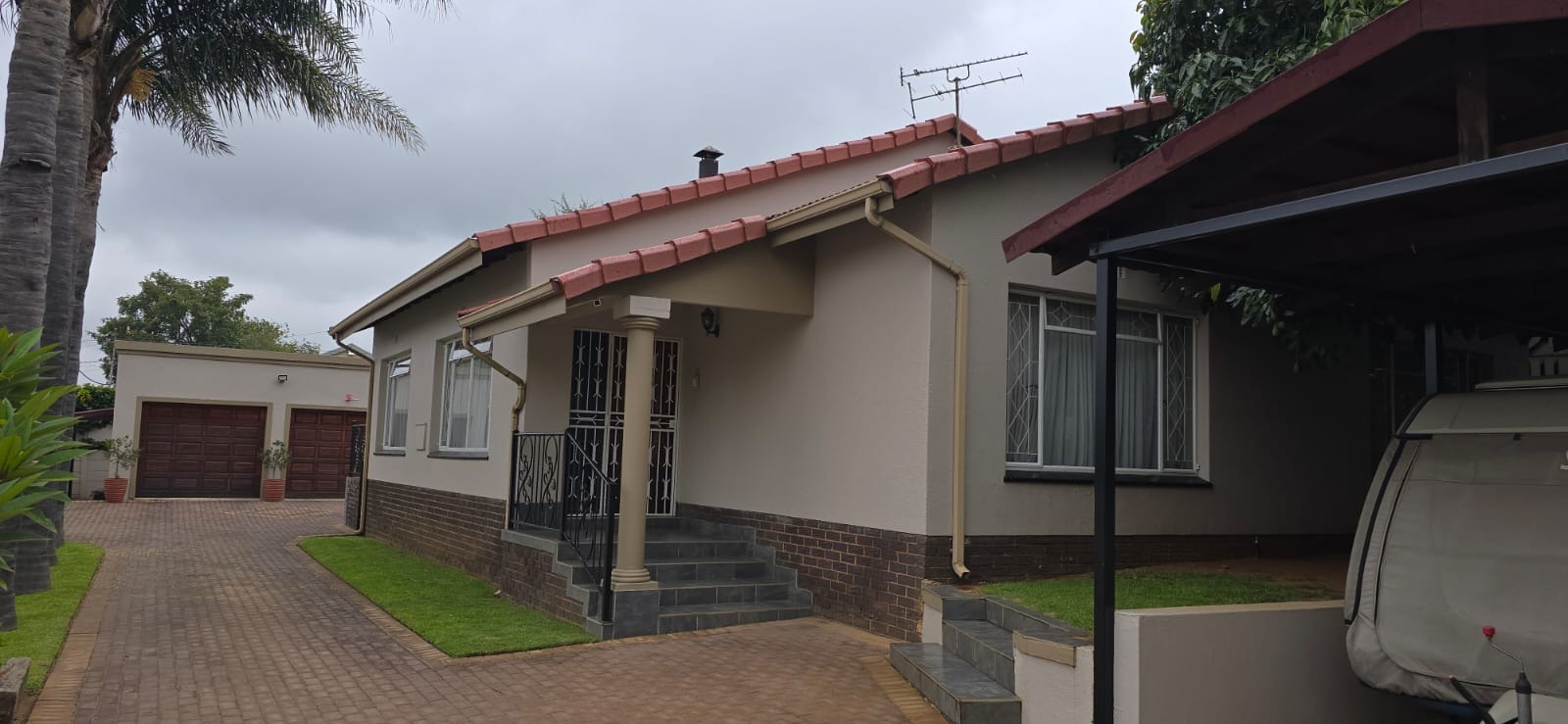 Parking is provided by double automated garages, an additional carport, and a paved driveway, while high perimeter walls ensure privacy and security.