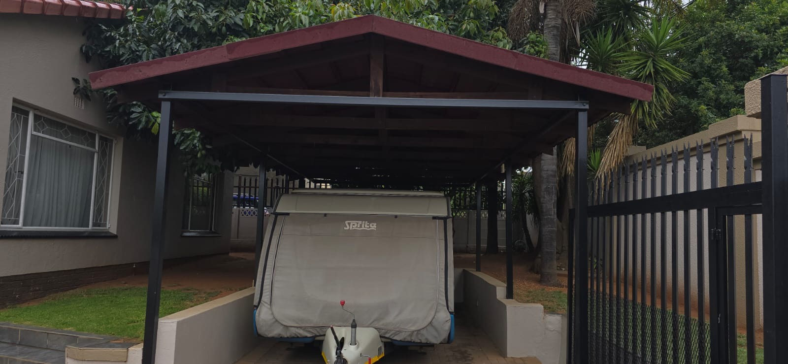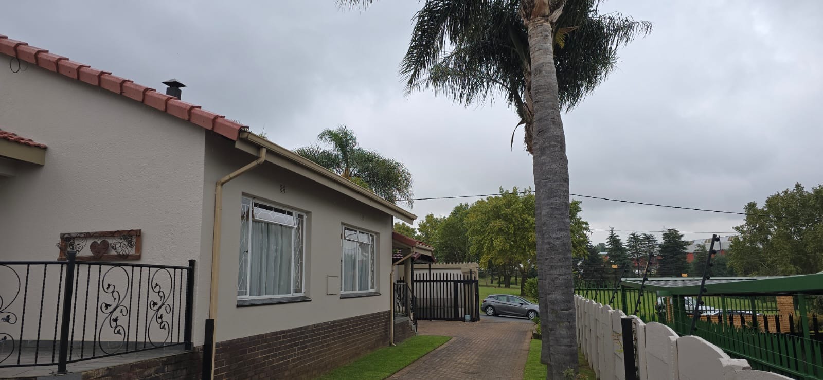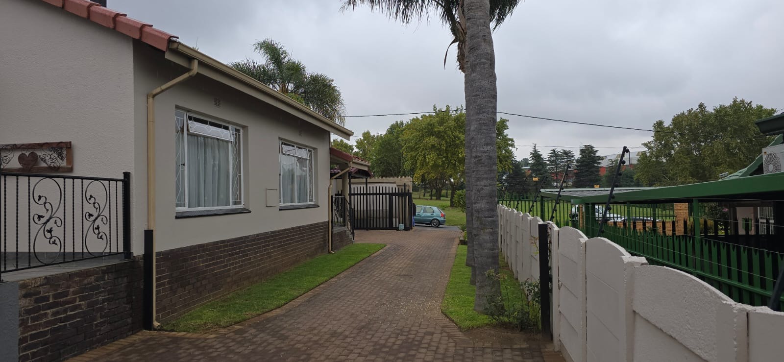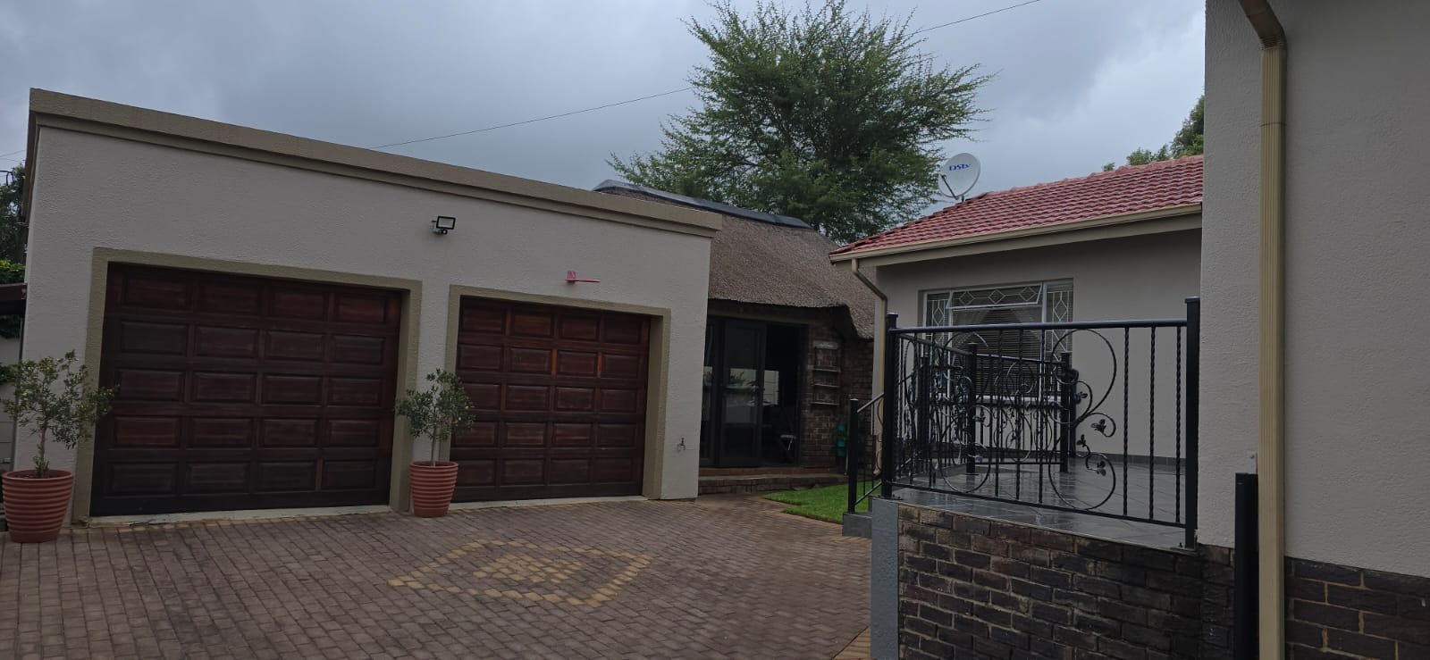 Parking is provided by double automated garages, an additional carport, and a paved driveway, while high perimeter walls ensure privacy and security.