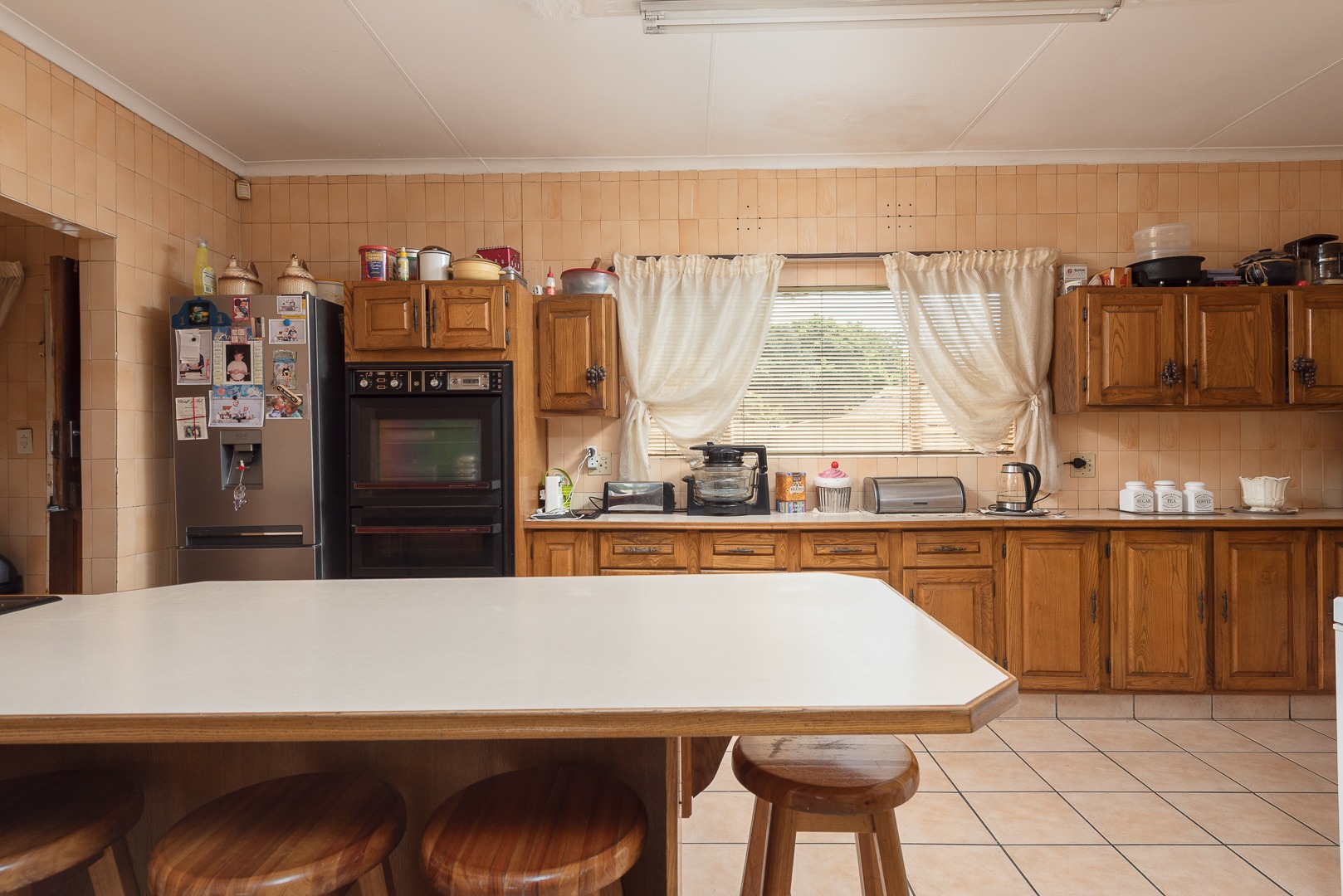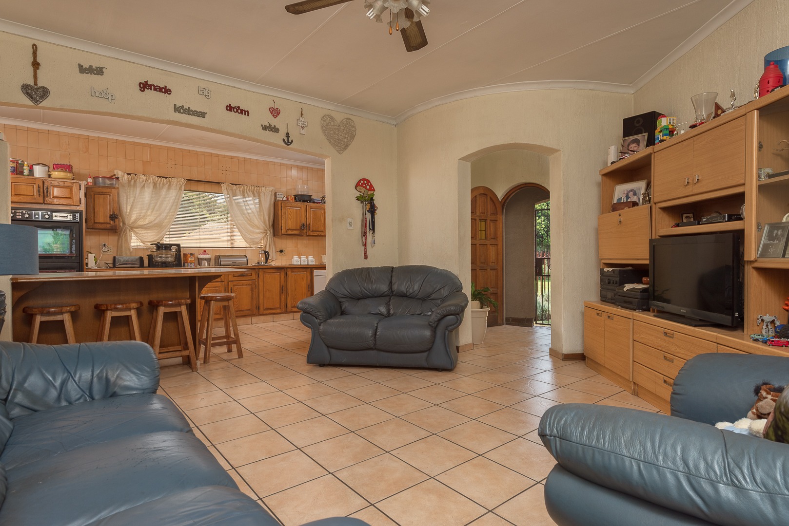 An open-plan living area and kitchen features practical tiled flooring and ceiling fans.
