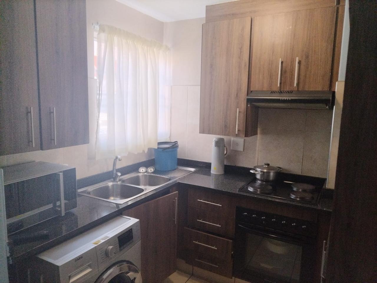 Discover modern living in this appealing 2-bedroom, 1-bathroom residence situated in the suburban heart of Alan Manor, Johannesburg. This well-maintained complex offers a comfortable and secure lifestyle, featuring contemporary grey building exteriors and neatly kept grassy outdoor areas that enhance its kerb appeal. The interior boasts an inviting open-plan layout, seamlessly connecting the living area with a modern kitchen. The kitchen is a highlight, equipped with sleek wood-look cabinetry, dark granite-style countertops, a double sink, and integrated appliances including a built-in oven, hob, and extractor fan, alongside space for a washing machine. Tiled flooring throughout ensures easy maintenance and a cohesive aesthetic. Both bedrooms are designed for comfort, sharing a well-appointed bathroom. The thoughtful layout maximises space and functionality, making it ideal for individuals or small families seeking a convenient home. Natural light filters through the windows, creating a bright and airy atmosphere. Residents benefit from access to a communal swimming pool, perfect for relaxation and recreation during warmer months. The complex prioritises safety with visible security cameras and 24-hour security, providing peace of mind. Paved pathways connect the various areas, contributing to the neat and organised environment. This property offers a practical and secure living solution within a desirable Johannesburg suburb. Its modern finishes and communal amenities present an excellent opportunity for those looking to purchase in a vibrant community. Key Features: * 2 Bedrooms, 1 Bathroom * Open-plan Living Area * Modern Kitchen with Built-in Appliances * Communal Swimming Pool * 24-Hour Security * Tiled Flooring Throughout * Well-maintained Complex Grounds * Suburban Alan Manor Location