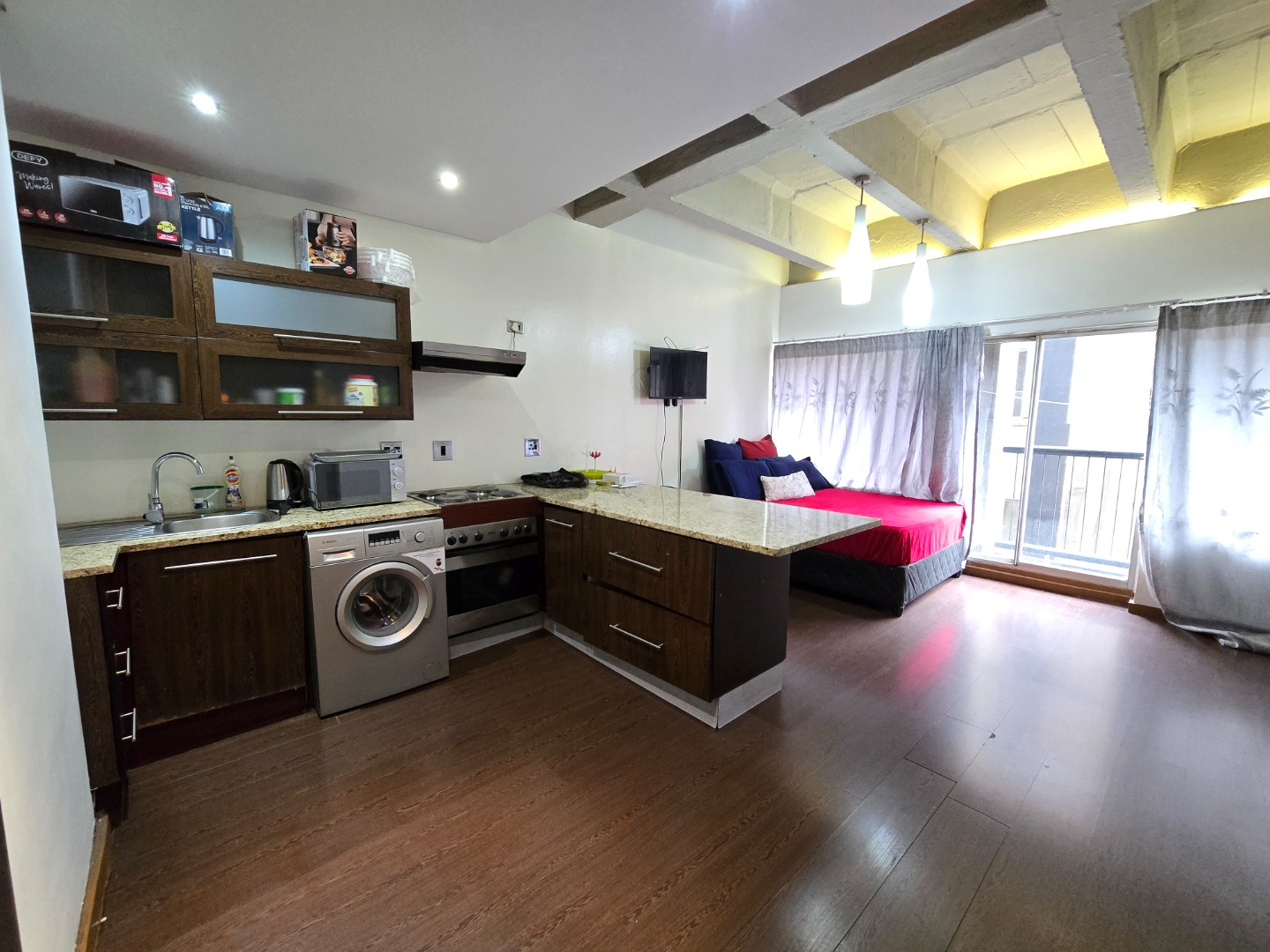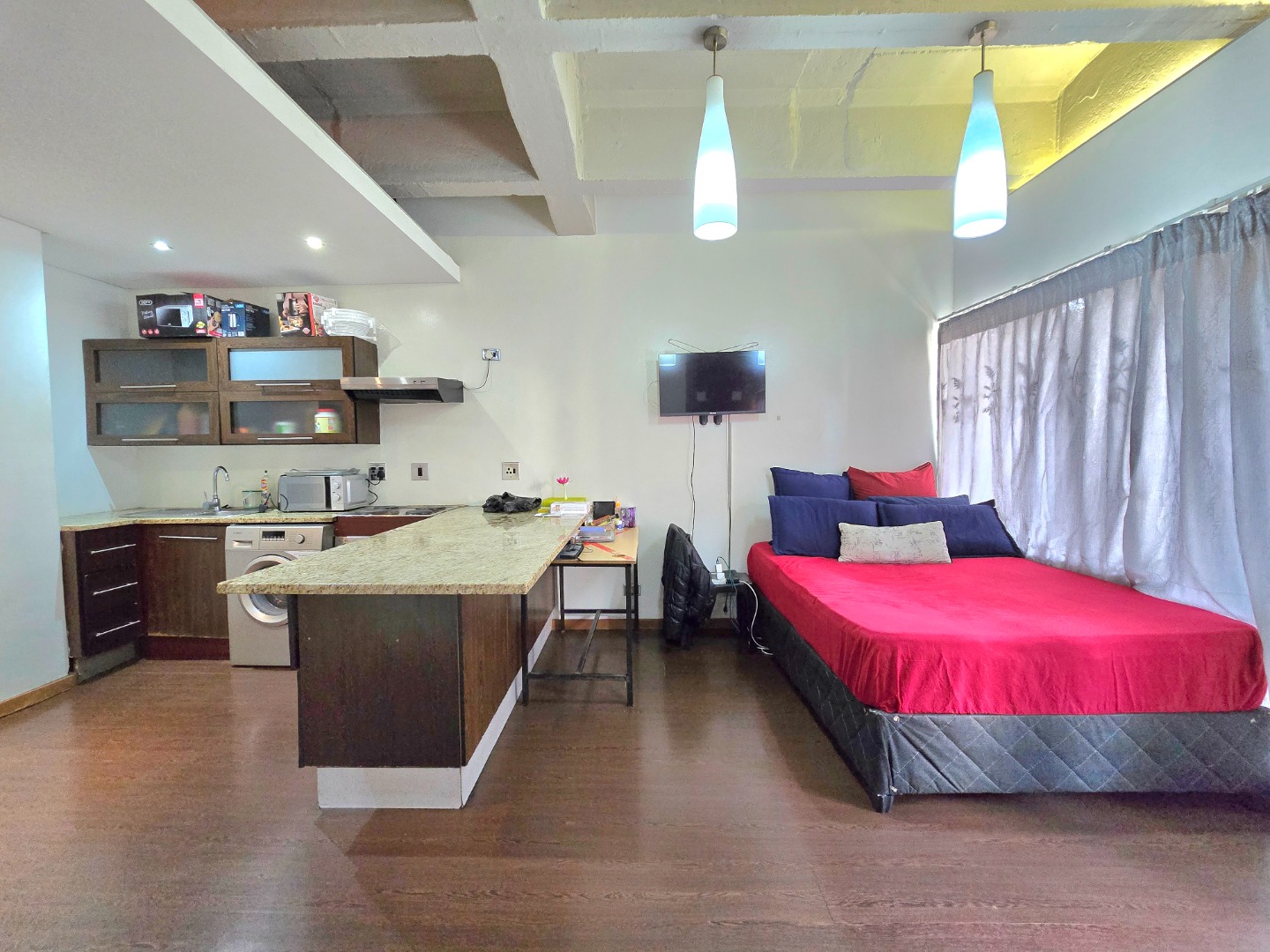 area. The kitchen flows seamlessly into the bedroom space thanks to its open-plan layout, beautifully enhanced by elegant chandelier lighting above.