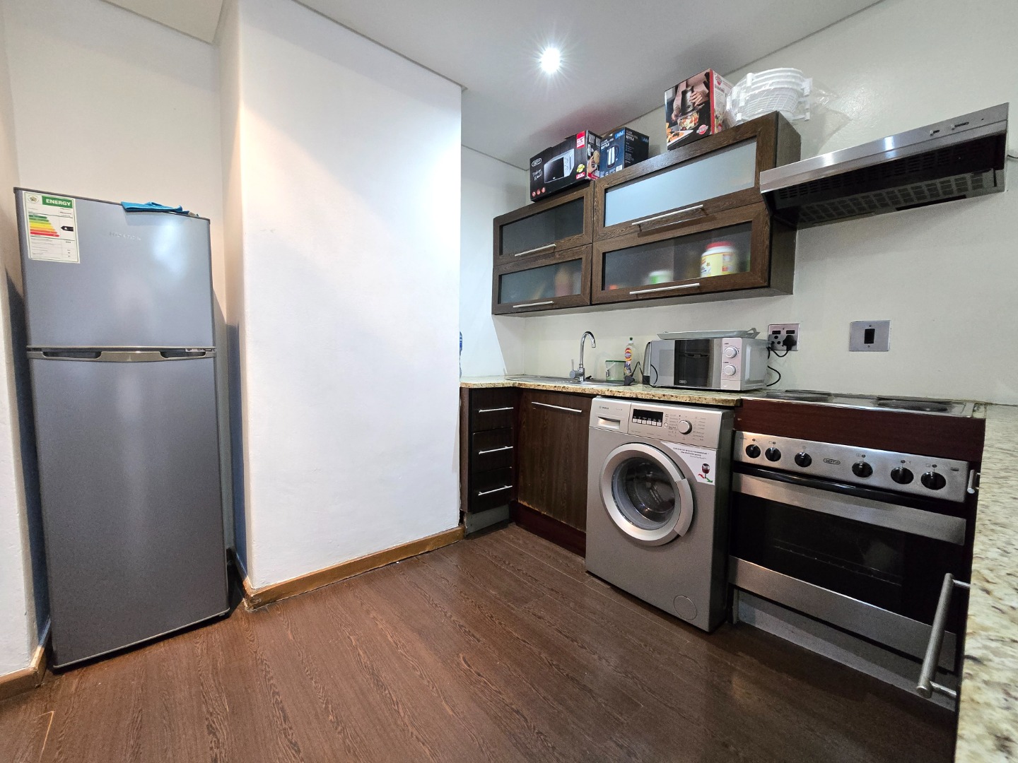 Upon entering, you’re welcomed by a well-designed kitchen offering ample cupboard space, sleek granite countertops, a 4-plate electric stove with oven, dedicated undercounter space for a washing machine, and a designated fridge