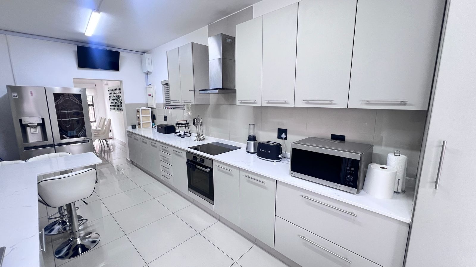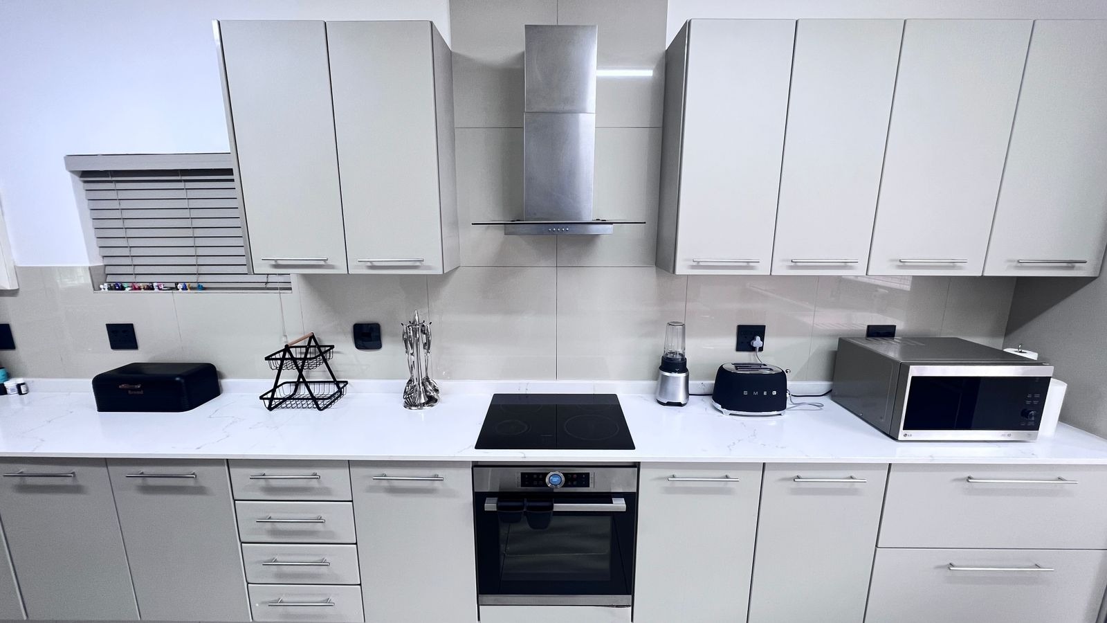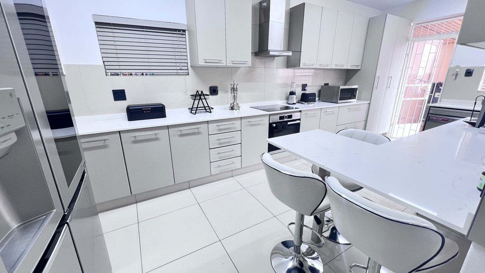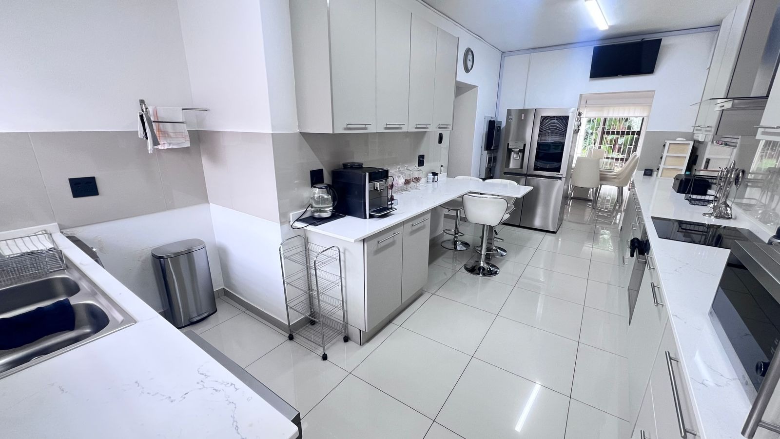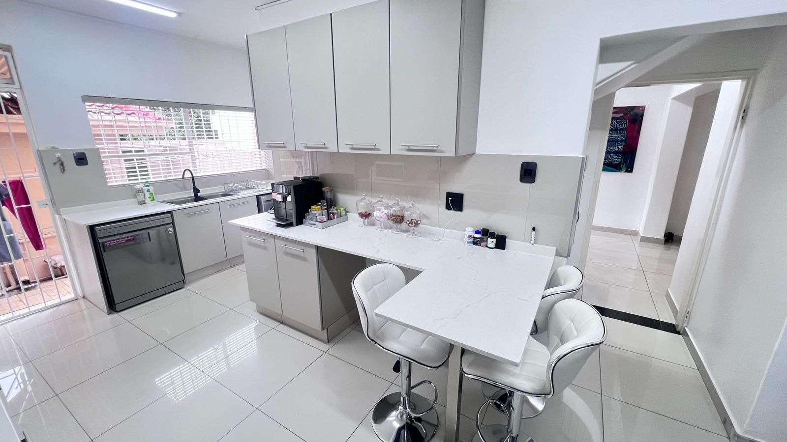 The contemporary kitchen is the heart of the home, featuring sleek white quartz countertops, ample cupboard space, and quality finishes—perfect for both daily use and entertaining.