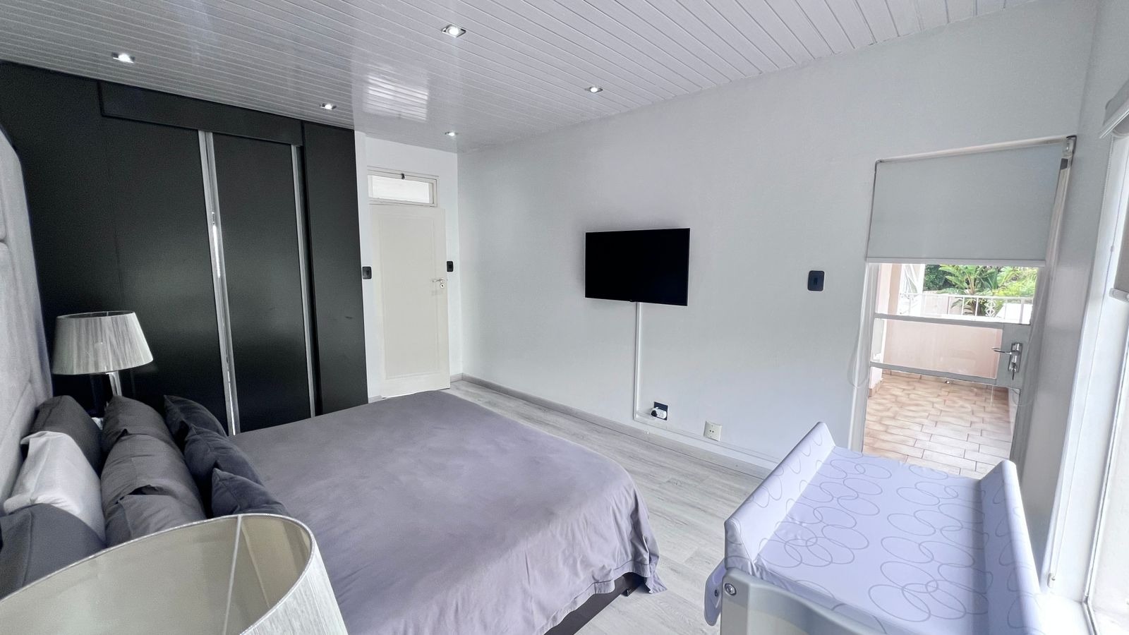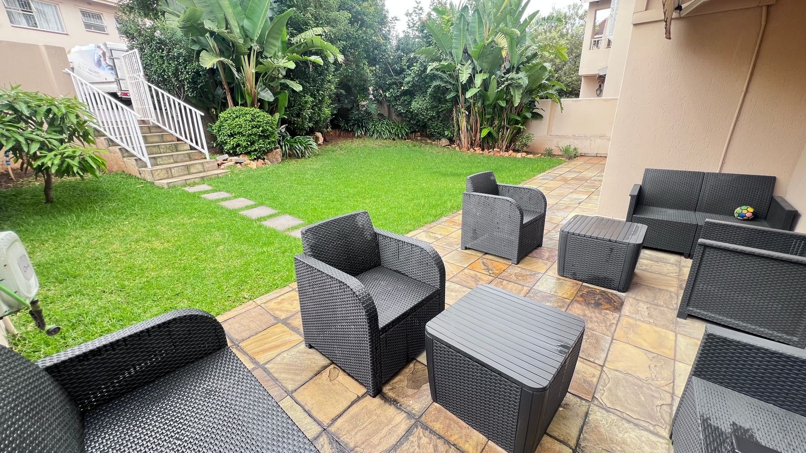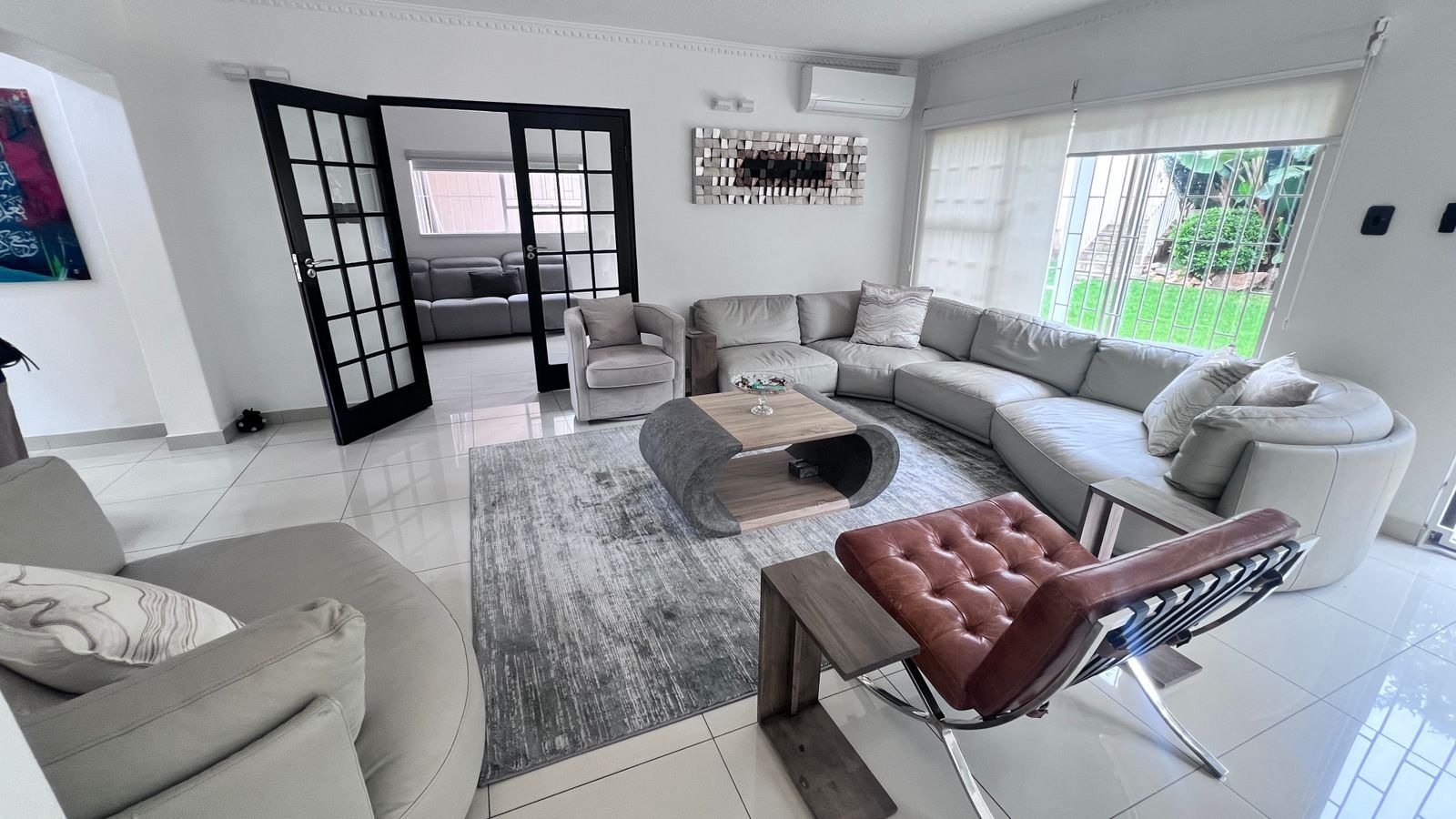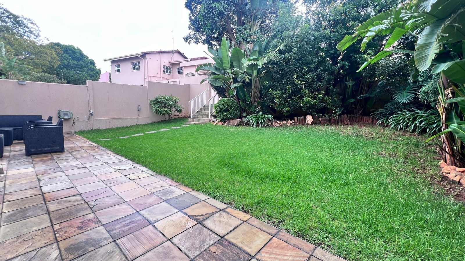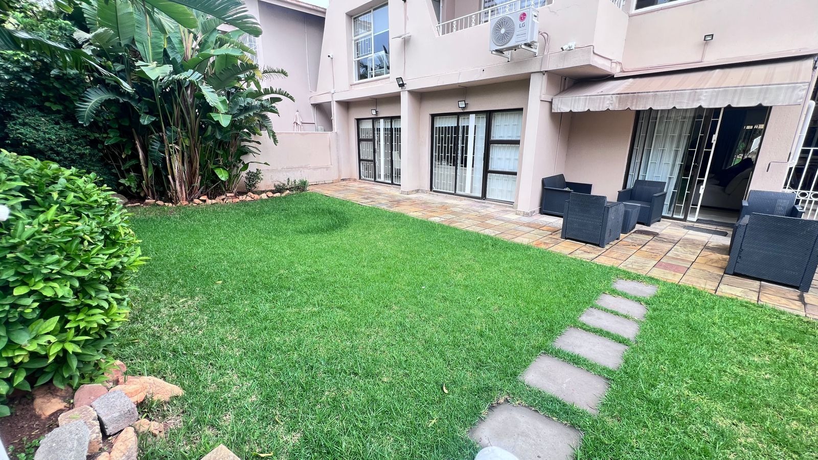 Sliding doors lead out to a well-kept private garden, ideal for outdoor gatherings, family time, or simply enjoying a peaceful environment.