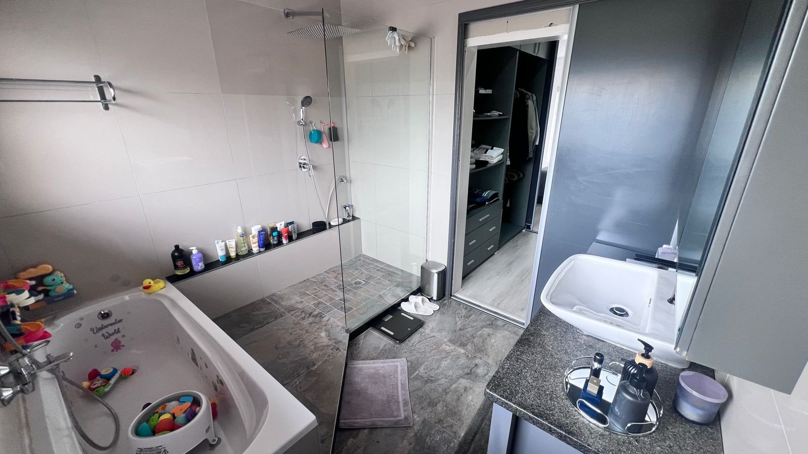 Two modern bathrooms service this level, including a main en-suite with a freestanding bath and a walk-in shower. The main bedroom offers a peaceful retreat with a calm and elegant atmosphere, while laminate flooring throughout the bedrooms adds warmth and comfort.