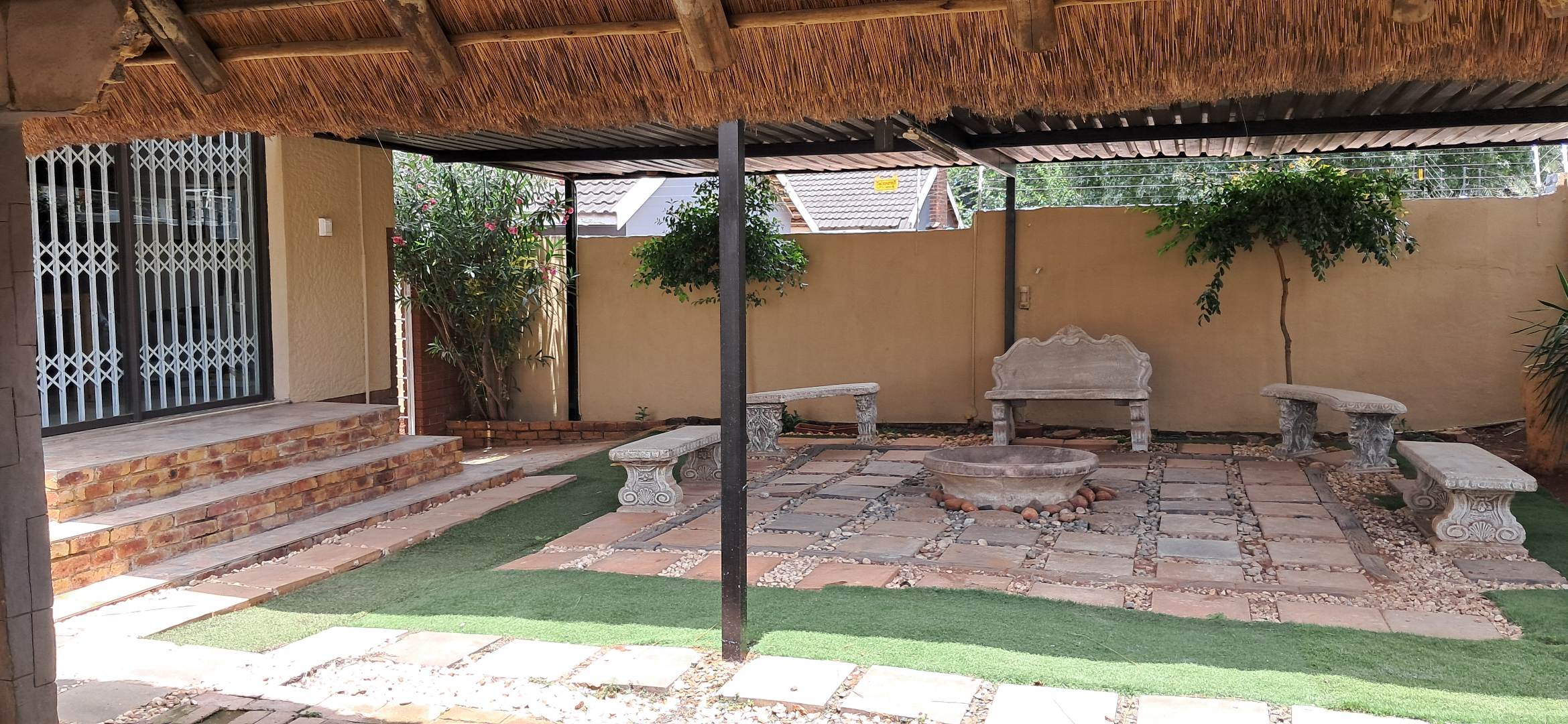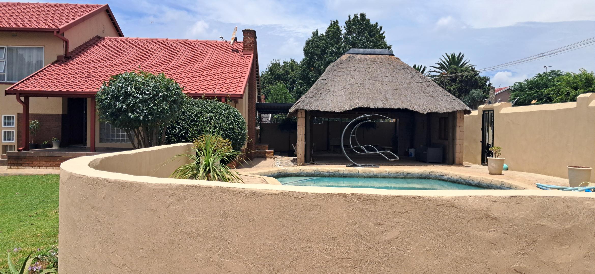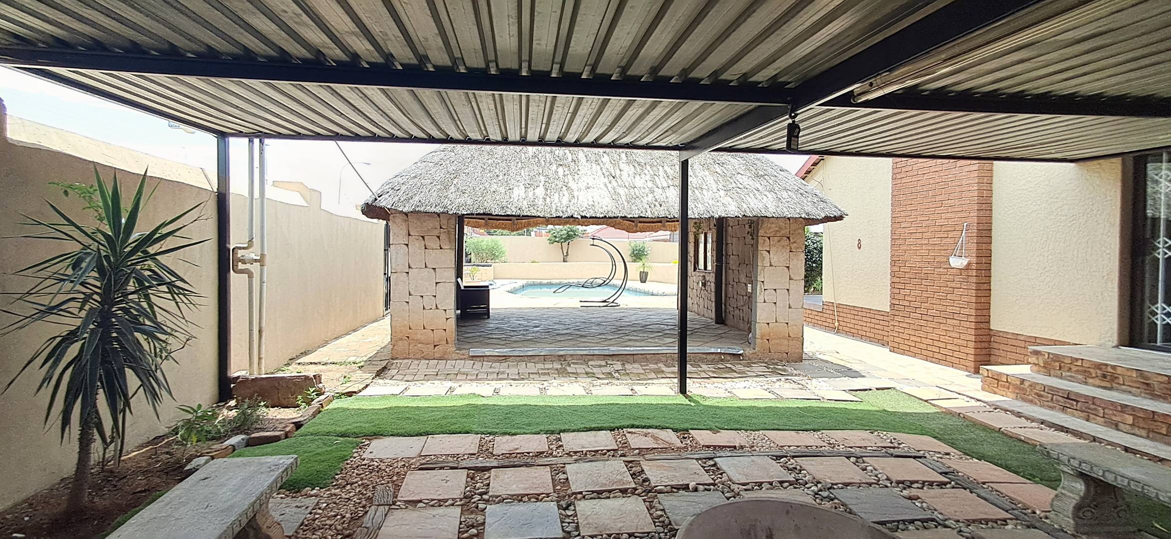 Step outside to discover a private oasis designed for outdoor living. The property boasts a large swimming pool, perfect for cooling off on warm days, complemented by a thatched lapa and a covered patio, offering shaded areas for relaxation and social gatherings. A dedicated fire pit area with stone seating provides an inviting spot for evening entertainment. The garden features a mix of paving, garden, and established greenery, creating a versatile and low-maintenance outdoor environment. Practical amenities include a double garage and additional parking for up to six vehicles, along with domestic rooms and outside toilets.