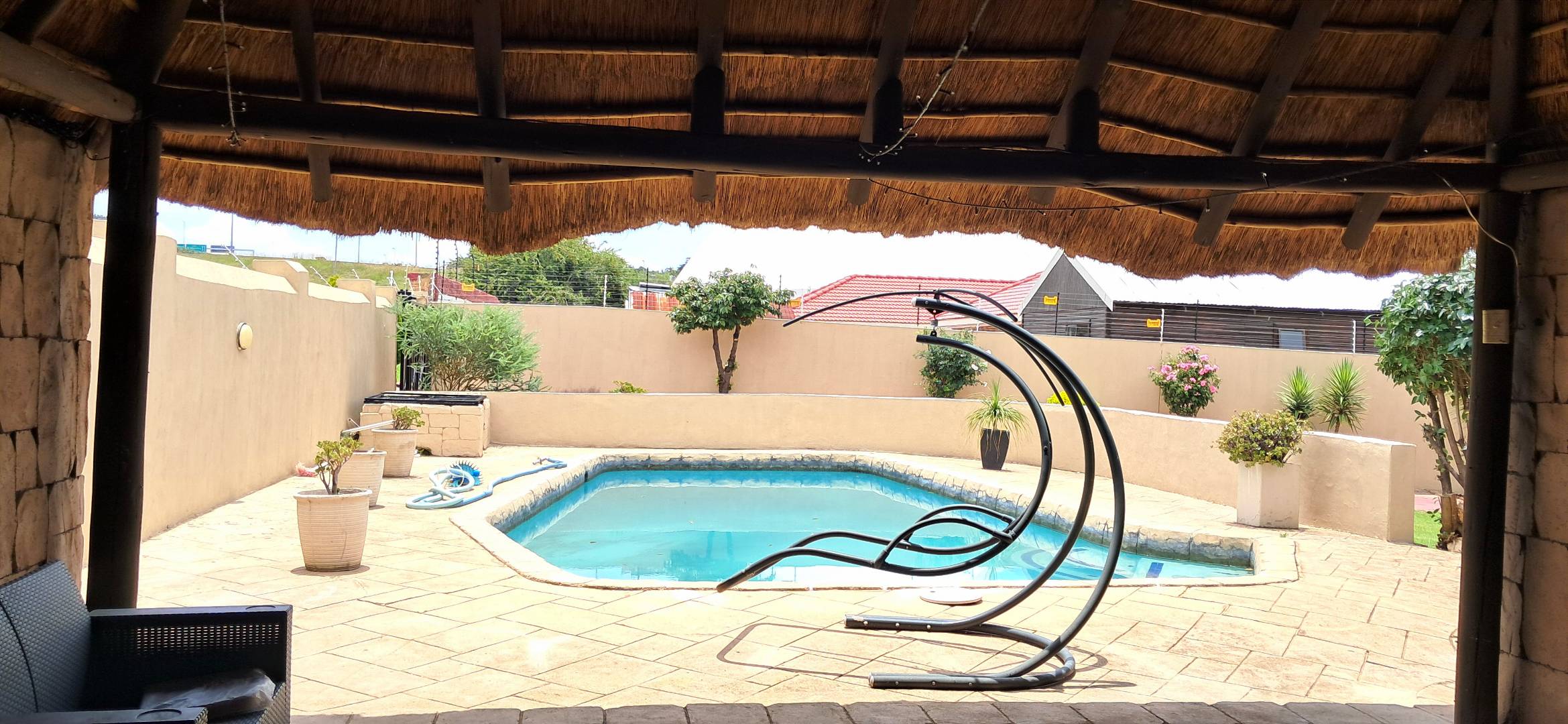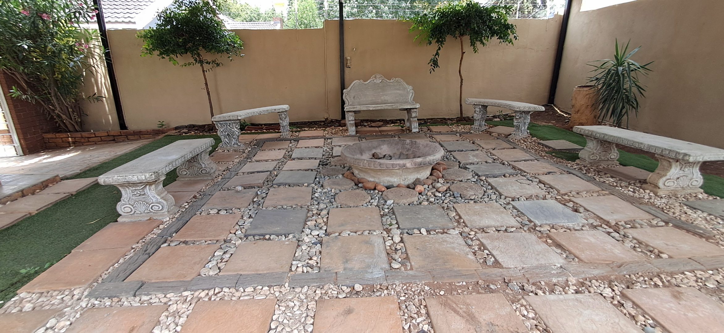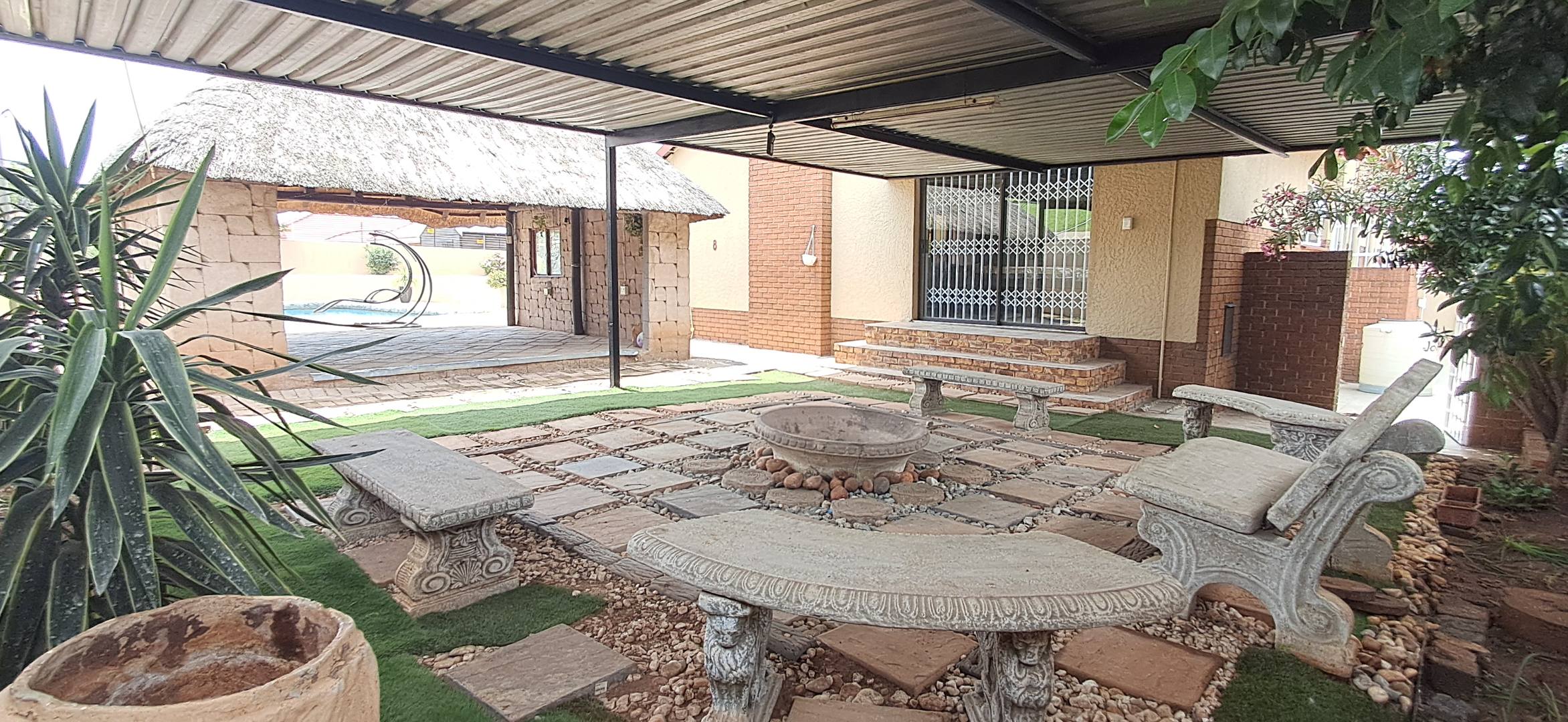 Step outside to discover a private oasis designed for outdoor living. The property boasts a large swimming pool, perfect for cooling off on warm days, complemented by a thatched lapa and a covered patio, offering shaded areas for relaxation and social gatherings. A dedicated fire pit area with stone seating provides an inviting spot for evening entertainment. The garden features a mix of paving, garden, and established greenery, creating a versatile and low-maintenance outdoor environment. Practical amenities include a double garage and additional parking for up to six vehicles, along with domestic rooms and outside toilets.