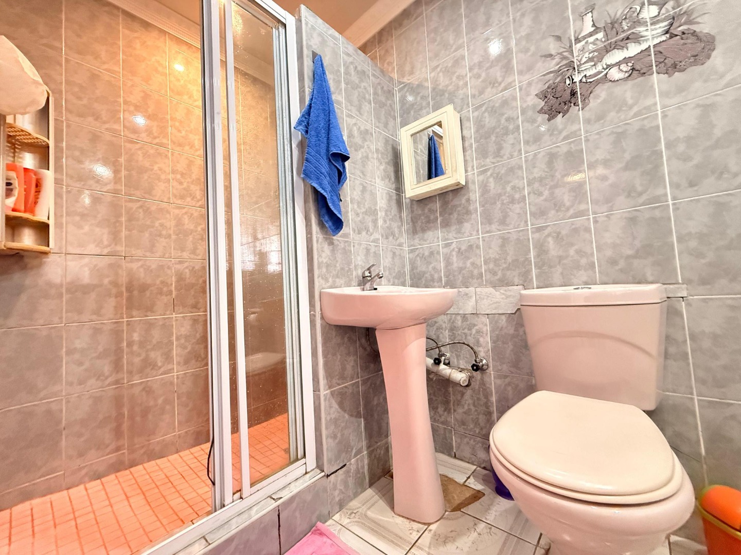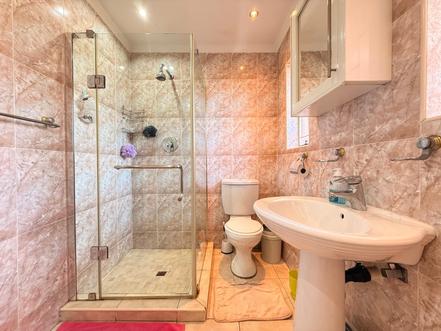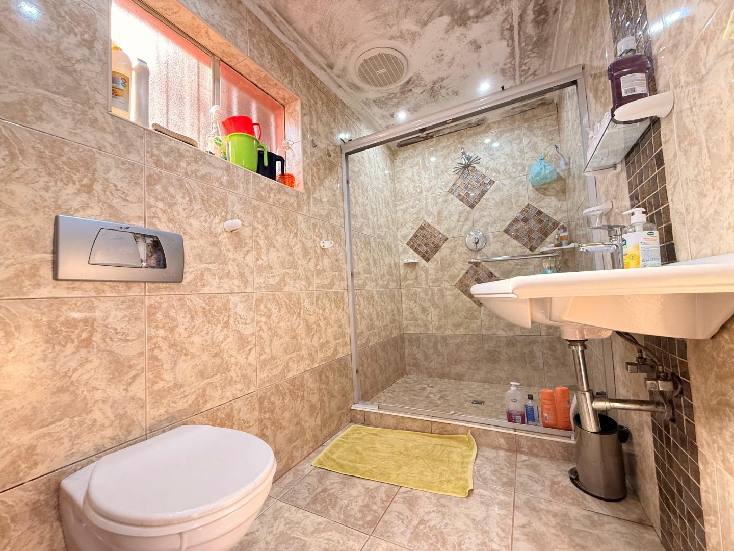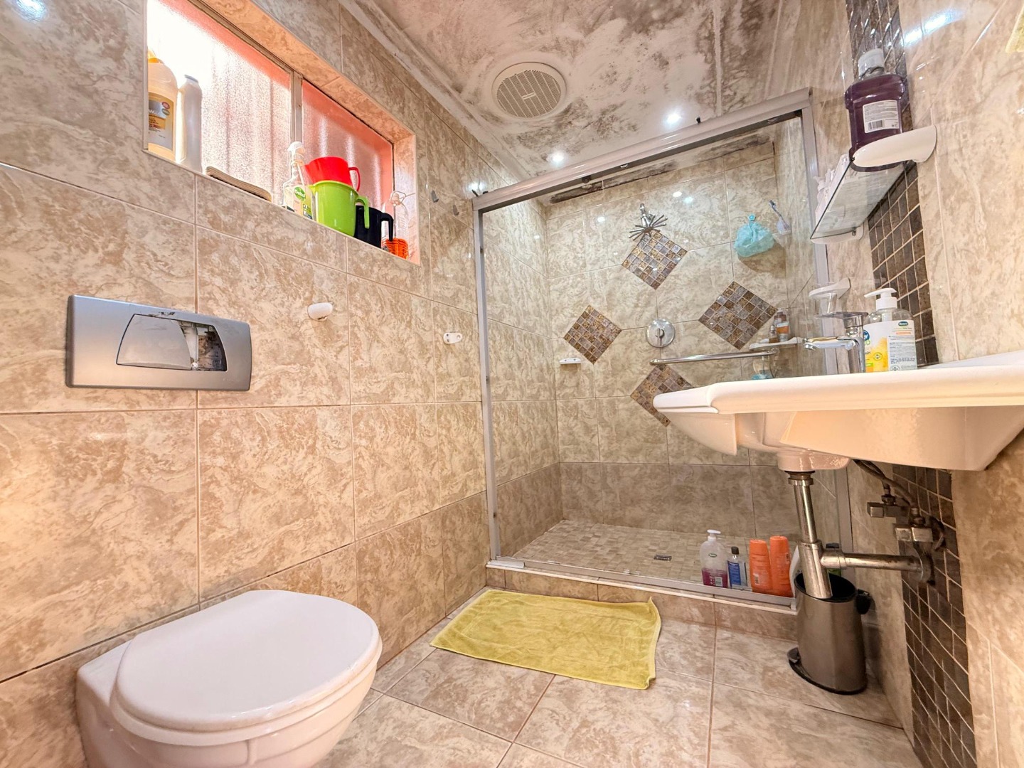 The bedrooms are well-sized with built-in cupboards and soft natural lighting, creating a restful and cozy atmosphere. The bathrooms are fully tiled with elegant finishes, including a spacious walk-in shower in the main bathroom. The master bedroom offers impressive storage and a serene, comfortable feel.