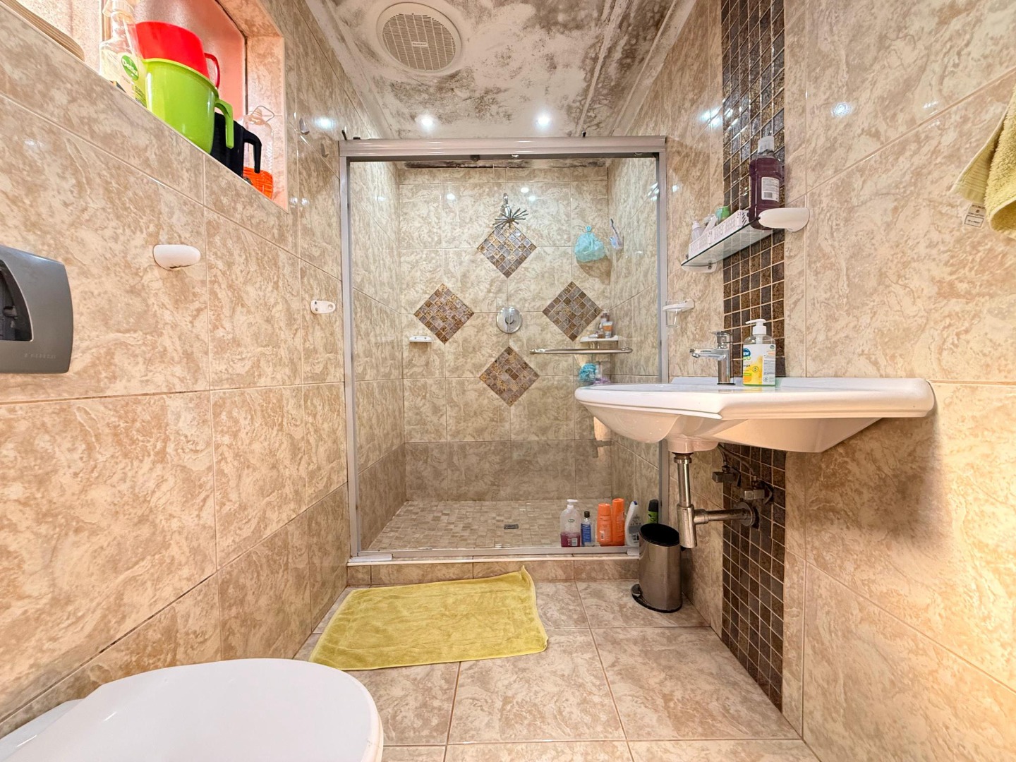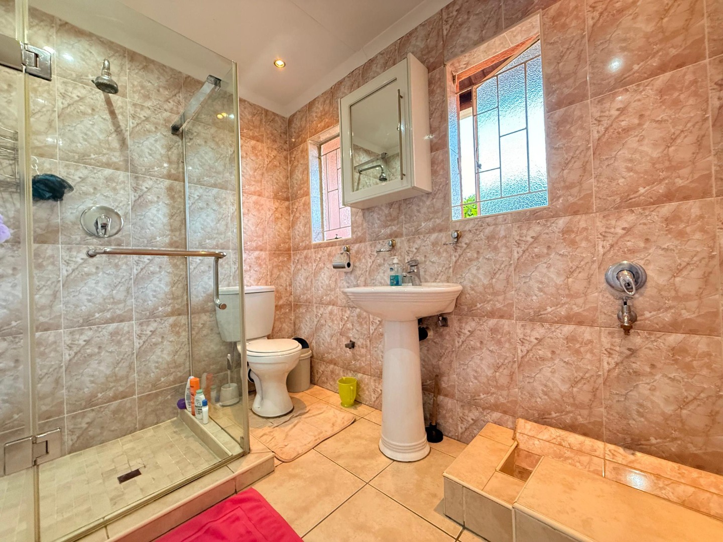 The bedrooms are well-sized with built-in cupboards and soft natural lighting, creating a restful and cozy atmosphere. The bathrooms are fully tiled with elegant finishes, including a spacious walk-in shower in the main bathroom. The master bedroom offers impressive storage and a serene, comfortable feel.
