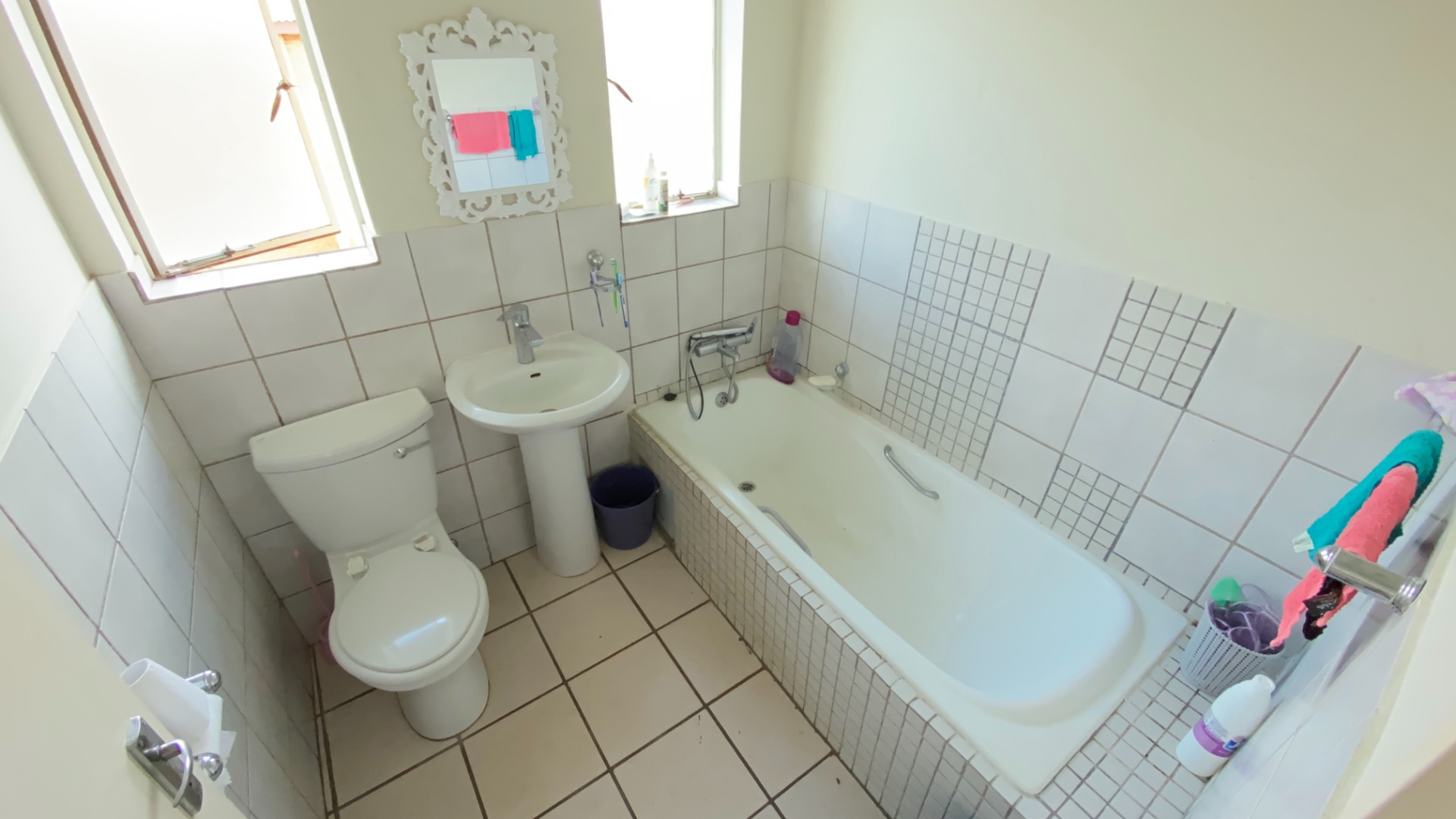 - Neat bathroom with tub, basin and toilet
