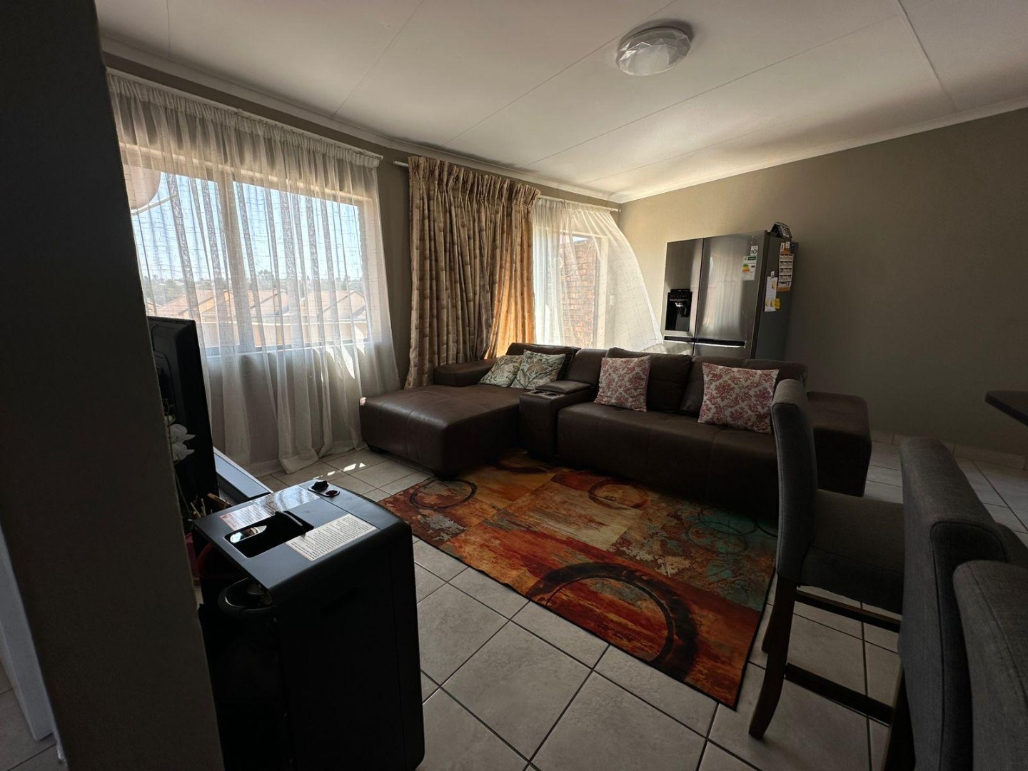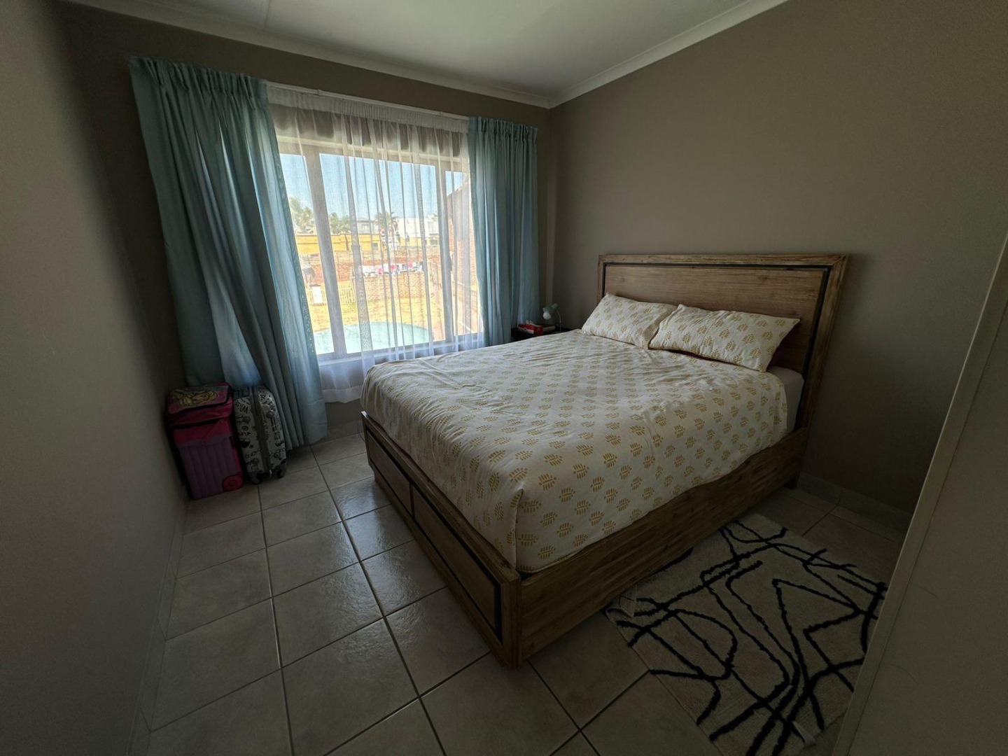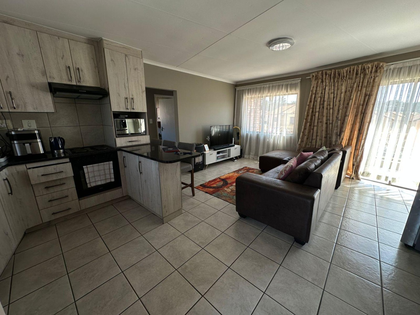 The home features a spacious open-plan lounge and dining area that flows seamlessly onto a private balcony with views over the complex – a great spot to relax after a long day. The kitchen is neat and functional, fitted with plenty of cupboard space and room for essential appliances.