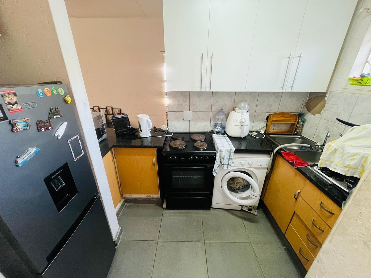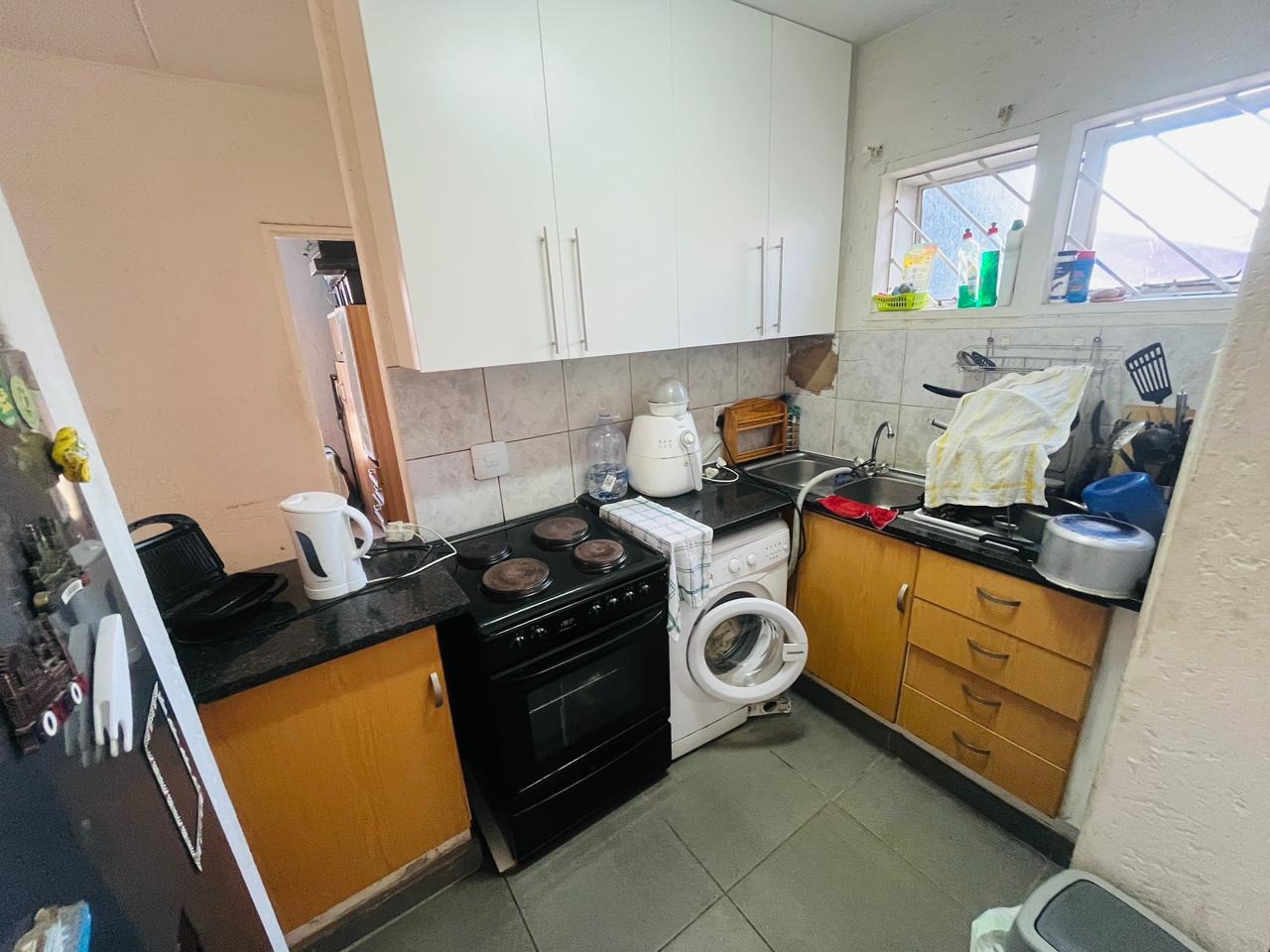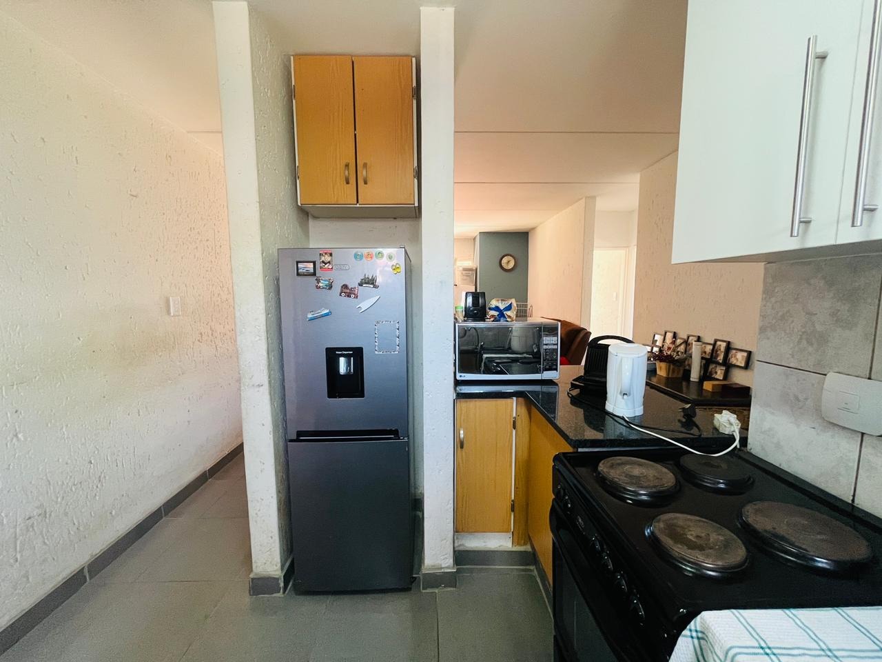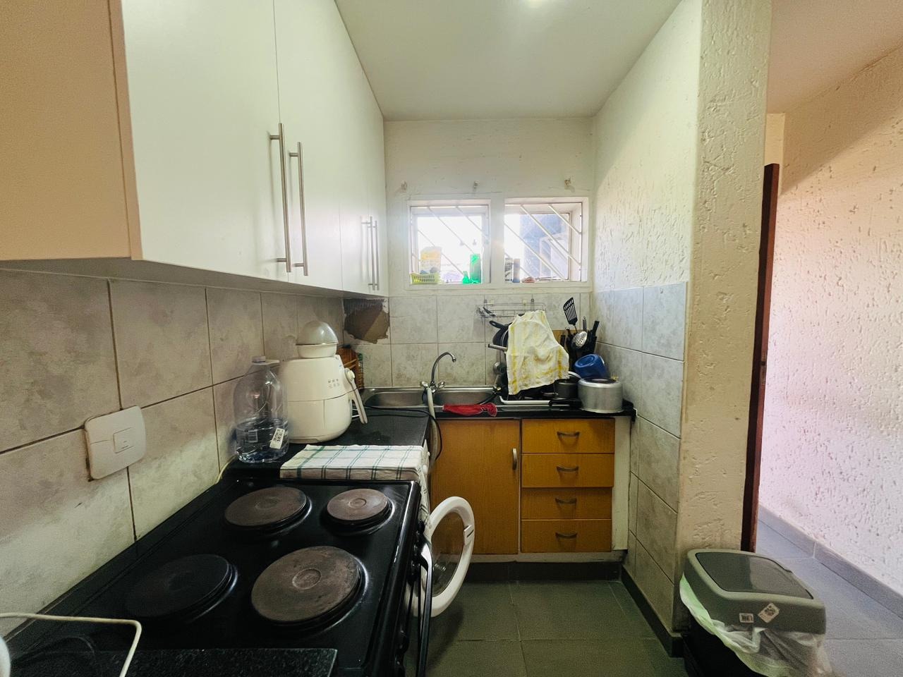 The kitchen is neatly fitted with ample built-in cupboards and practical countertop space, offering a functional layout that makes cooking and daily living both convenient and enjoyable.