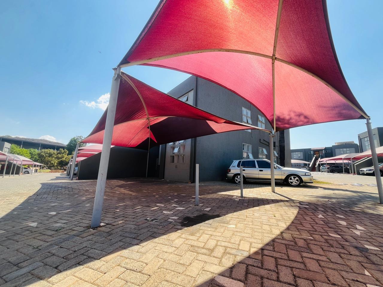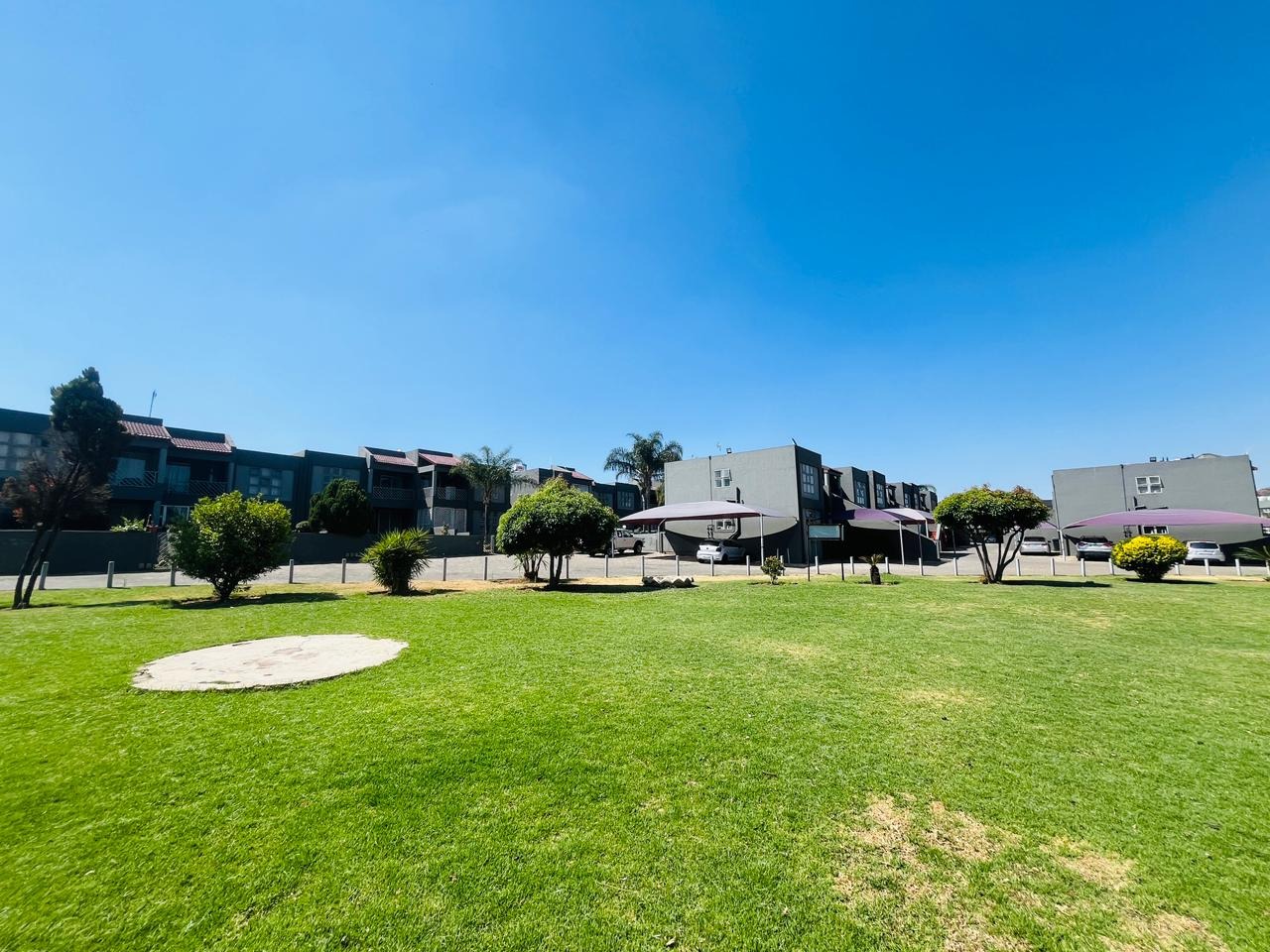 Shaded parking bays and paved driveways throughout the complex
