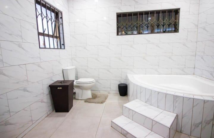 Inside, the home features generous open-plan living spaces with large windows and sliding doors that invite natural light and promote seamless indoor-outdoor flow. The tiled finishes create a clean, low-maintenance environment ideal for busy families. The modernised bathrooms are beautifully renovated with high-end tiles, walk-in shower, and a feature corner bath — giving the home a stylish, updated feel.