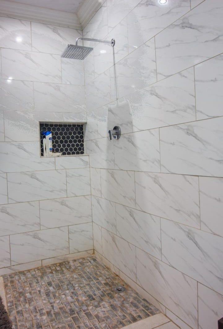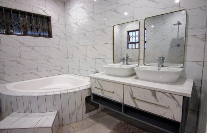 Inside, the home features generous open-plan living spaces with large windows and sliding doors that invite natural light and promote seamless indoor-outdoor flow. The tiled finishes create a clean, low-maintenance environment ideal for busy families. The modernised bathrooms are beautifully renovated with high-end tiles, walk-in shower, and a feature corner bath — giving the home a stylish, updated feel.