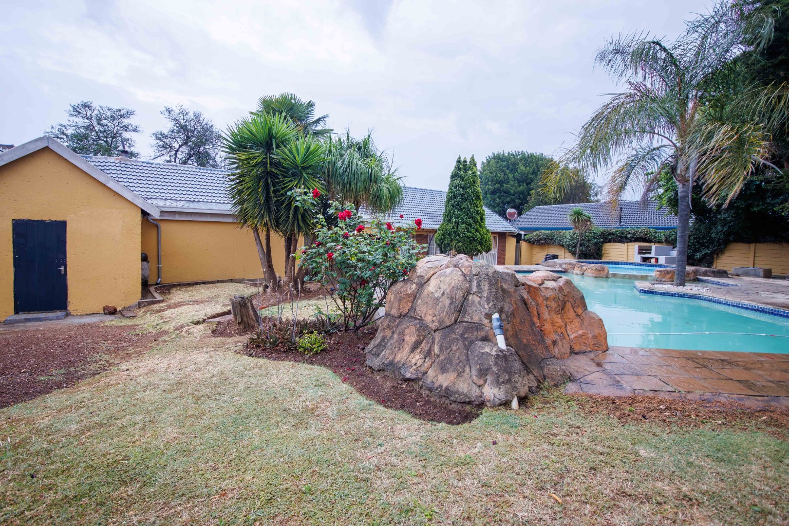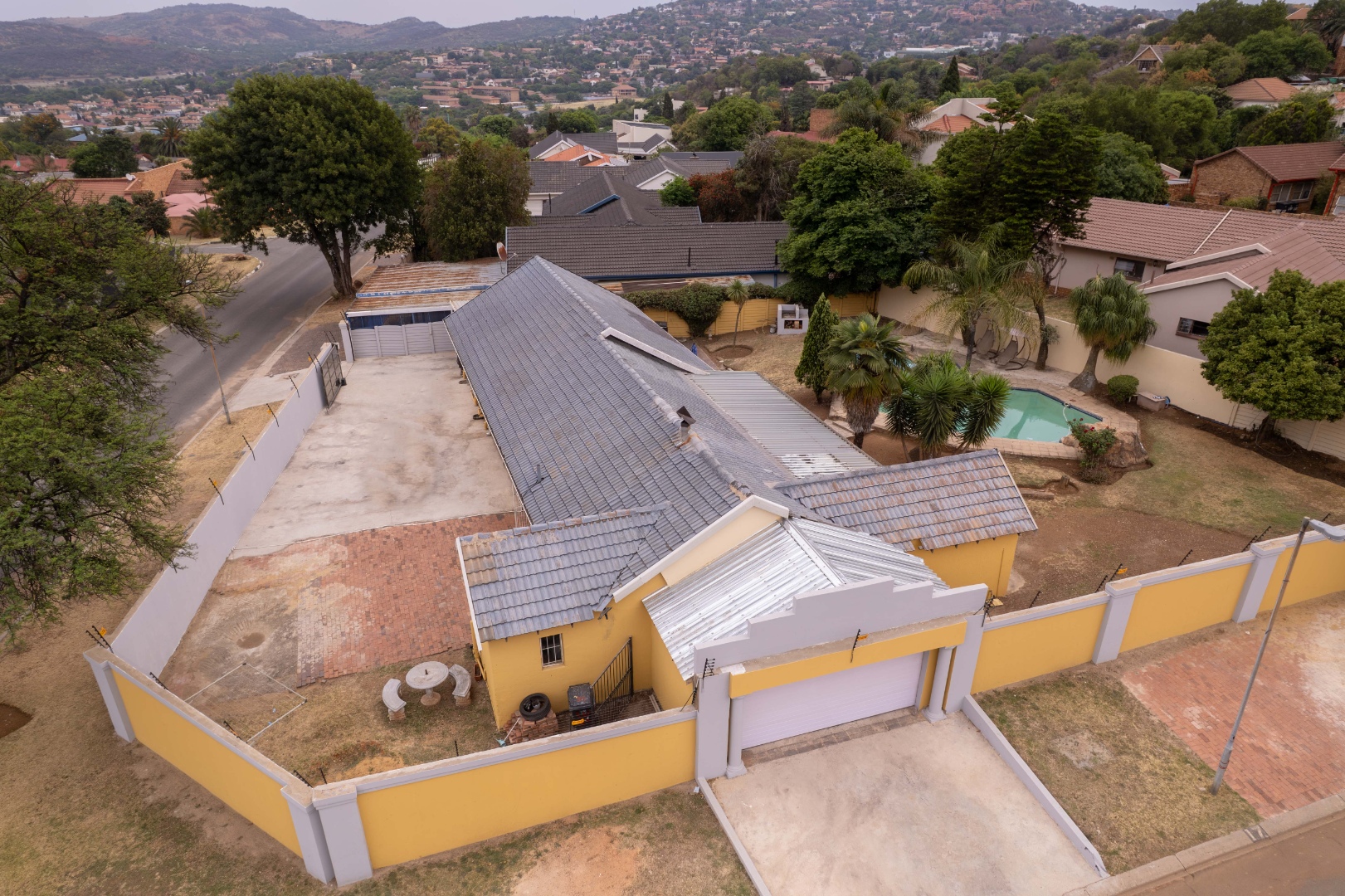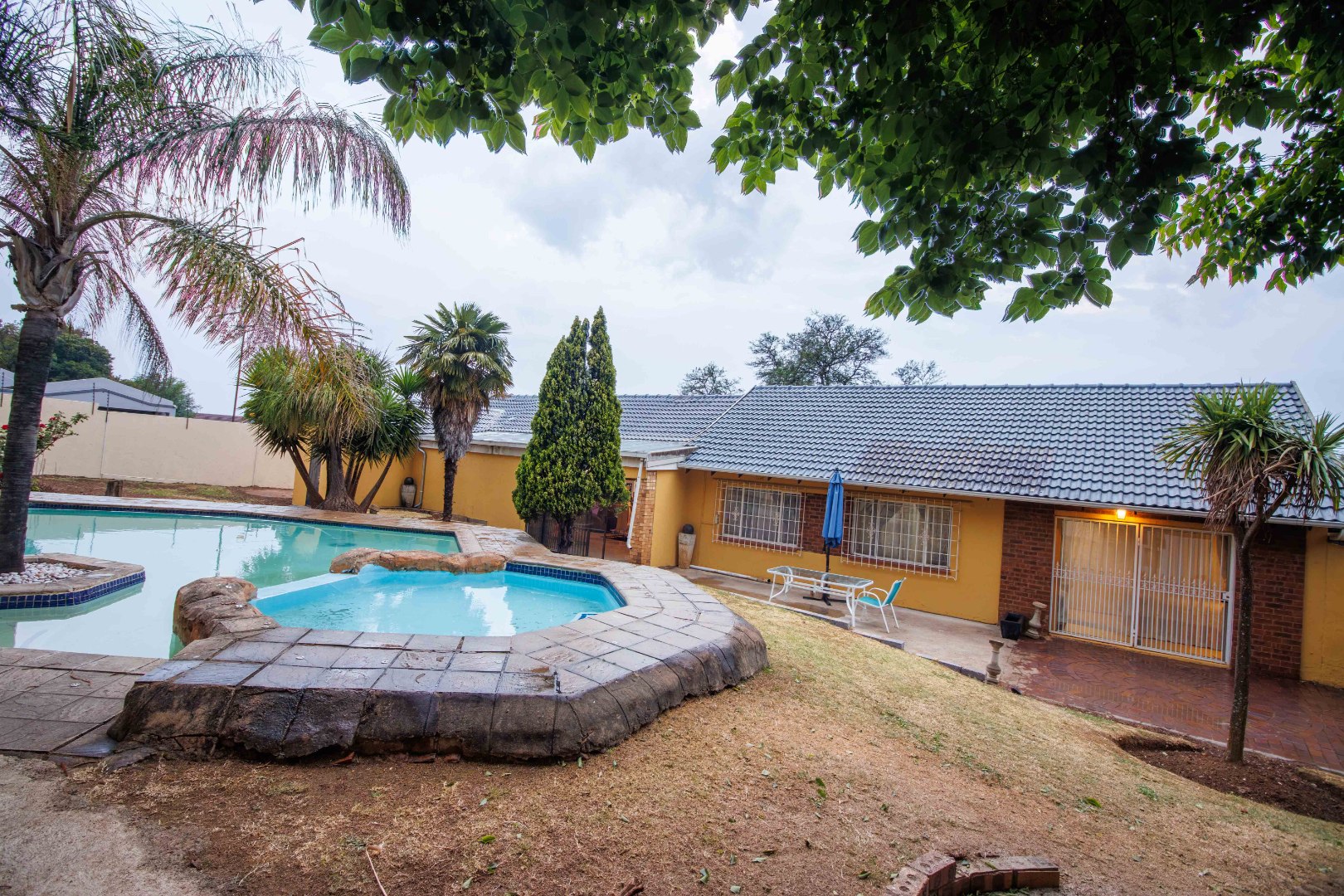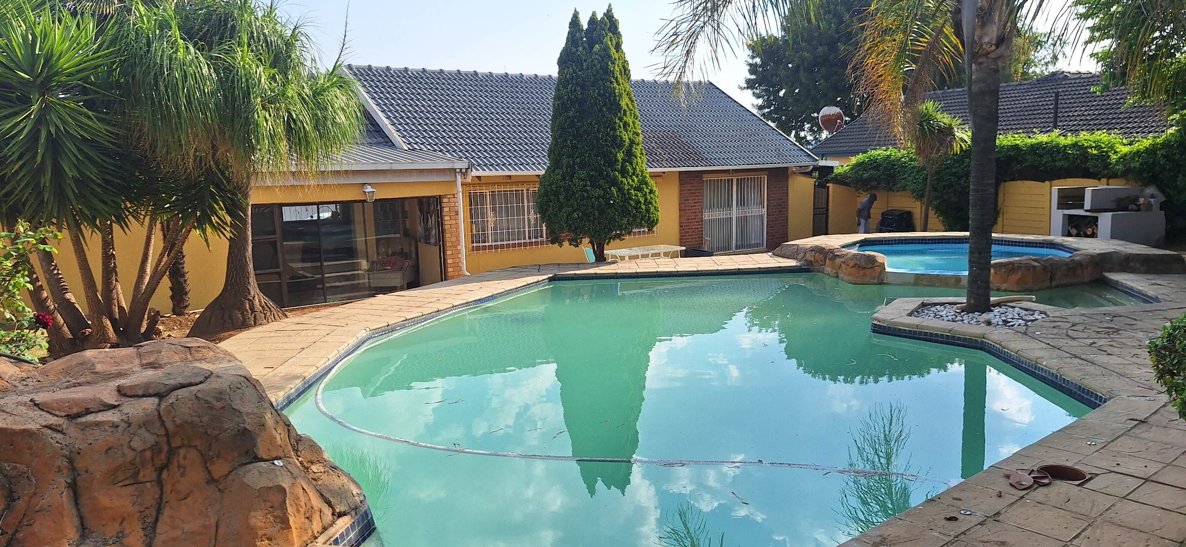 Discover this inviting four-bedroom, two-bathroom family home situated in the desirable suburban area of Mulbarton, Johannesburg. The property immediately impresses with its strong kerb appeal, featuring a high perimeter wall with an electric fence and an attractive two-tone yellow and grey exterior. A paved driveway leads to three garages, offering ample secure parking for up to 12 vehicles, ensuring convenience and peace of mind. Step inside to an intelligently designed open-plan living space, seamlessly integrating a modern kitchen, dining area, and lounge. The kitchen boasts sleek two-tone cabinetry, black countertops, and integrated stainless steel appliances, including a double oven and microwave. Stylish tiled flooring flows throughout, complemented by accent LED lighting. The versatile layout includes a dedicated home gym area and a built-in bar, perfect for entertaining or relaxation. Large sliding doors enhance the indoor-outdoor flow, leading directly to the private outdoor oasis. The residence offers four comfortable bedrooms, with the main bedroom featuring an en-suite bathroom, providing a private retreat. The additional bathroom serves the remaining bedrooms, catering to family needs. Security is paramount, with burglar bars on windows and security gates on doors, alongside an alarm system, ensuring a safe living environment. Outside, the property truly shines with a spacious freeform swimming pool and an adjacent smaller pool/spa, ideal for leisure and enjoyment. A dedicated outdoor braai area is perfect for alfresco dining, set within a garden featuring mature trees that provide shade and a tranquil atmosphere. An outside toilet adds to the convenience of the outdoor amenities. This Mulbarton home combines modern living with robust security and excellent outdoor facilities, making it an ideal choice for families seeking comfort and convenience in a well-established Johannesburg suburb. Key Features: * 4 Bedrooms, 2 Bathrooms (1 En-suite) * Open-Plan Living with Modern Kitchen * Dedicated Home Gym Area * Built-in Bar and Fireplace * Large Freeform Swimming Pool with Spa * Outdoor Braai Area and Garden * 3 Garages and 12 Parking Spaces * High Perimeter Wall with Electric Fencing * Burglar Bars and Security Gates * Erf Size: 953 sqm, Floor Size: 196 sqm