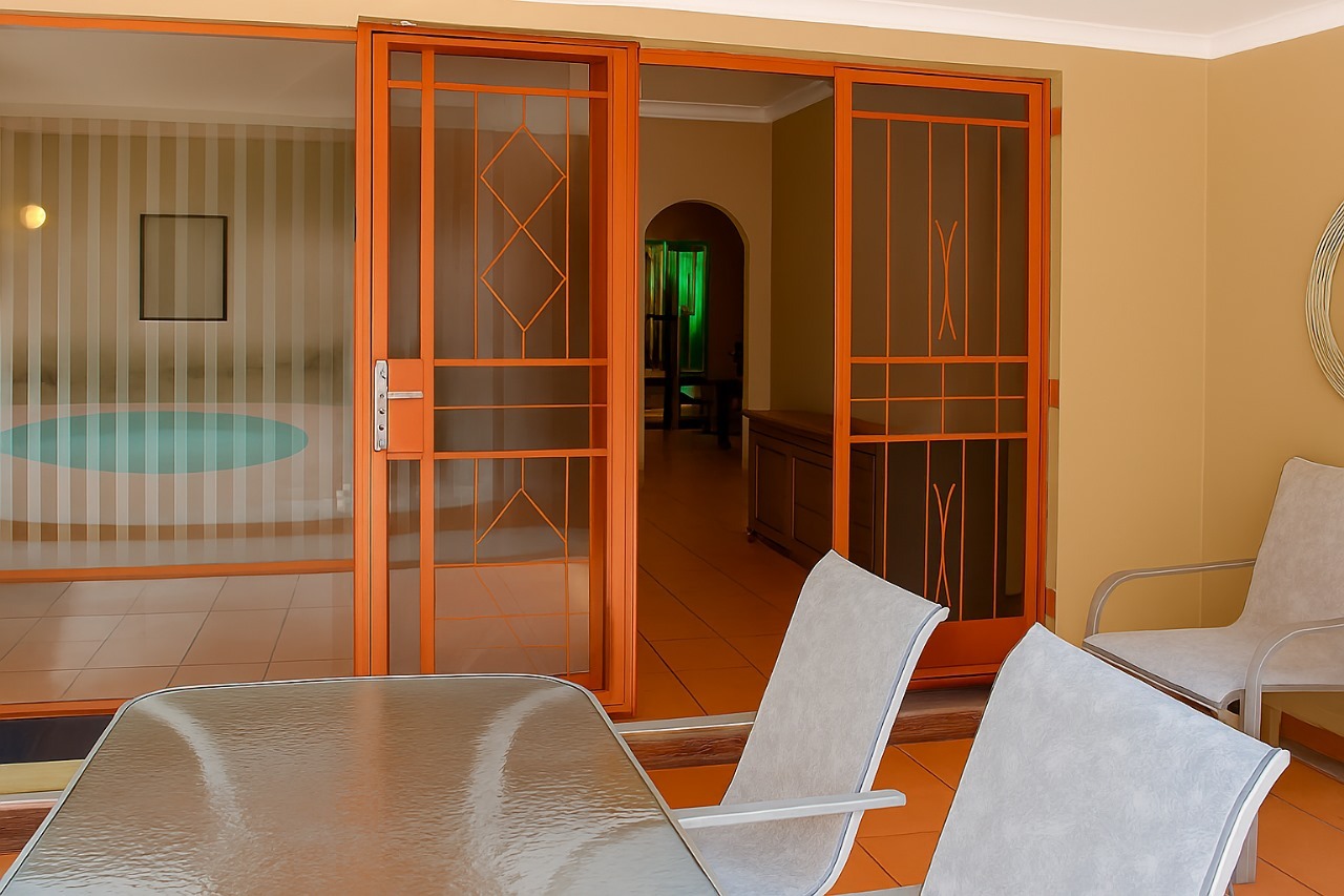 Sliding doors opening onto a spacious tiled patio