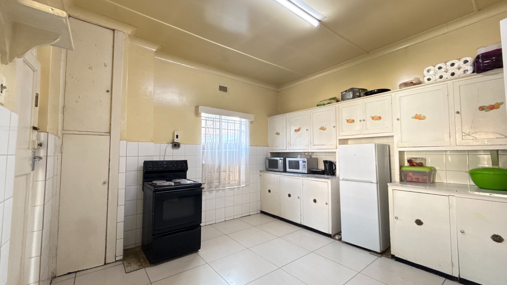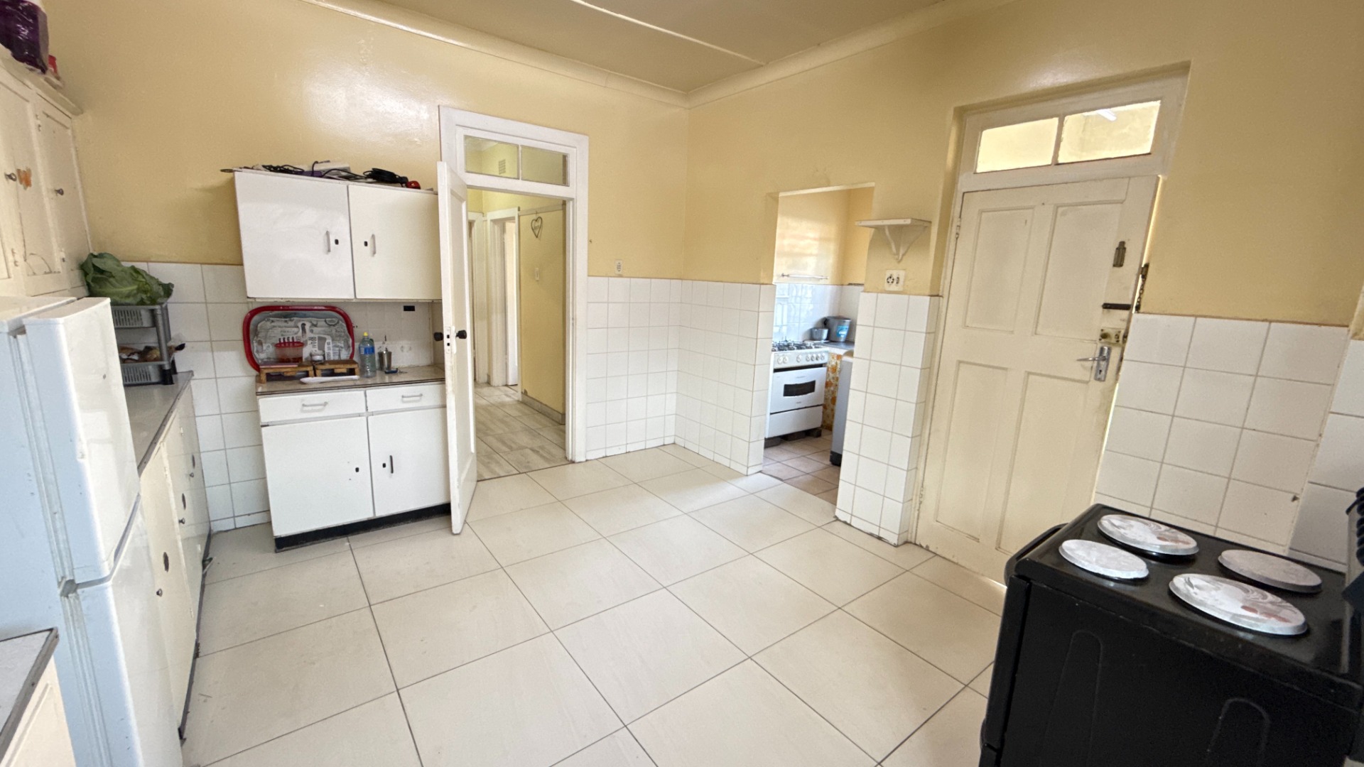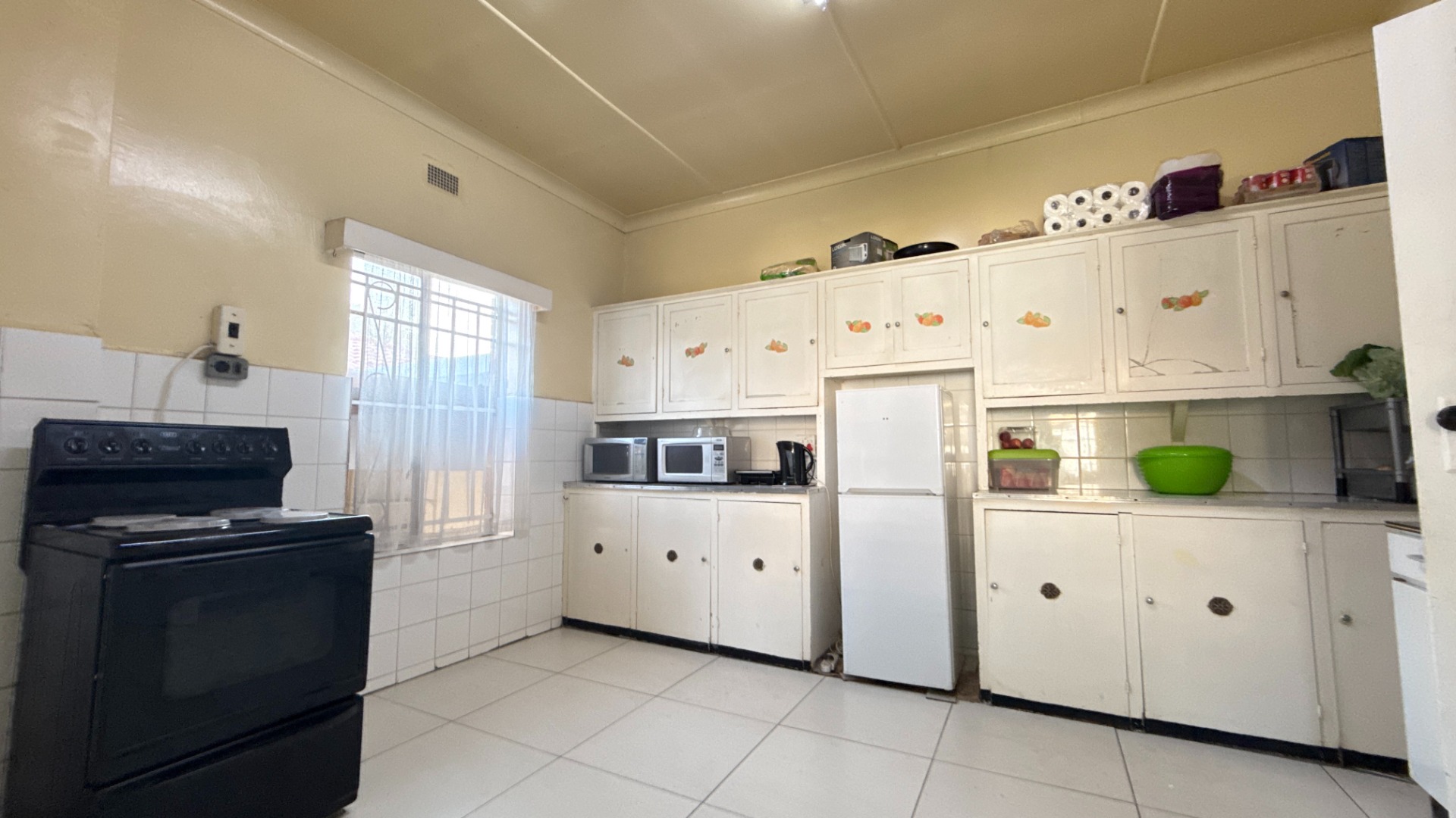 The kitchen is spacious, with plenty of built-in cupboards and room for appliances—perfect for day-to-day family living.