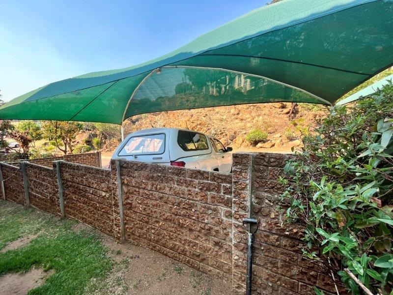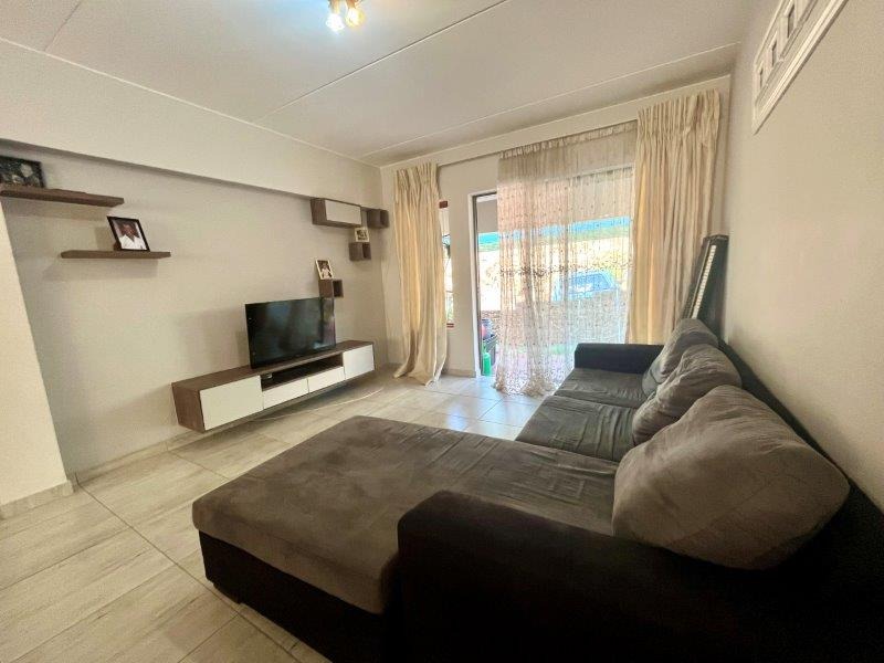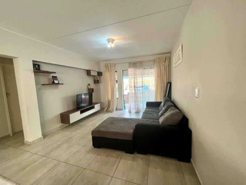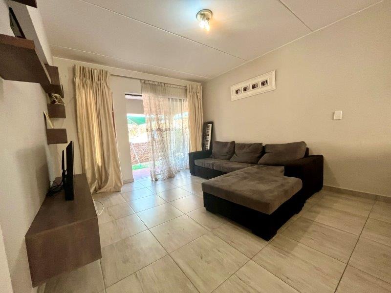 Large sliding doors lead you onto a covered patio that looks out over a private, fully walled small garden — a wonderful setting for quiet mornings, relaxed afternoons, or weekend braais in complete privacy.