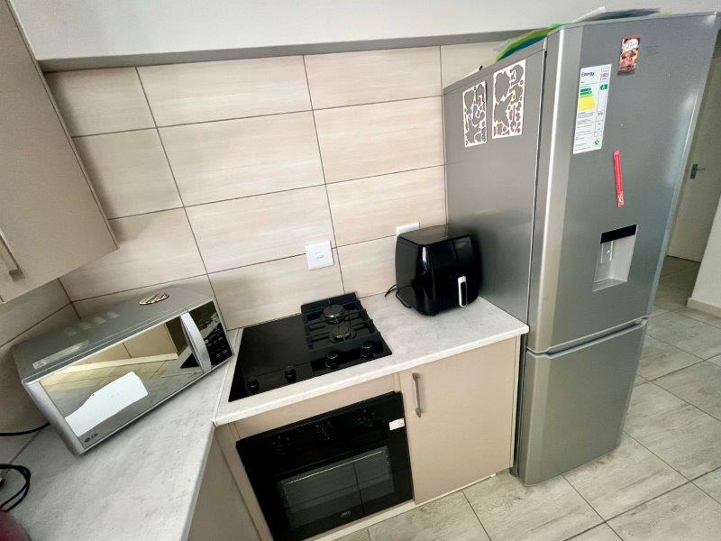From the moment you enter, you’re greeted by bright, open-plan living areas complemented with sleek tiling and designed for both comfort and low-maintenance living. The stylish kitchen is a standout feature — complete with a modern layout, dual gas and electric stove plates , an electric under counter oven, generous cabinetry, and dedicated space for a washing machine and fridge. The breakfast counter flows naturally into the sunlit lounge and dining area, enhanced with a fitted TV stand and floating shelves for a clean, modern feel.