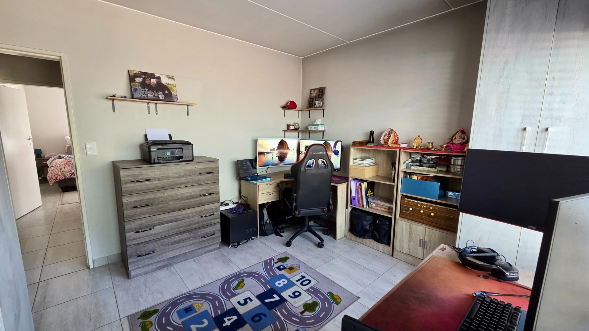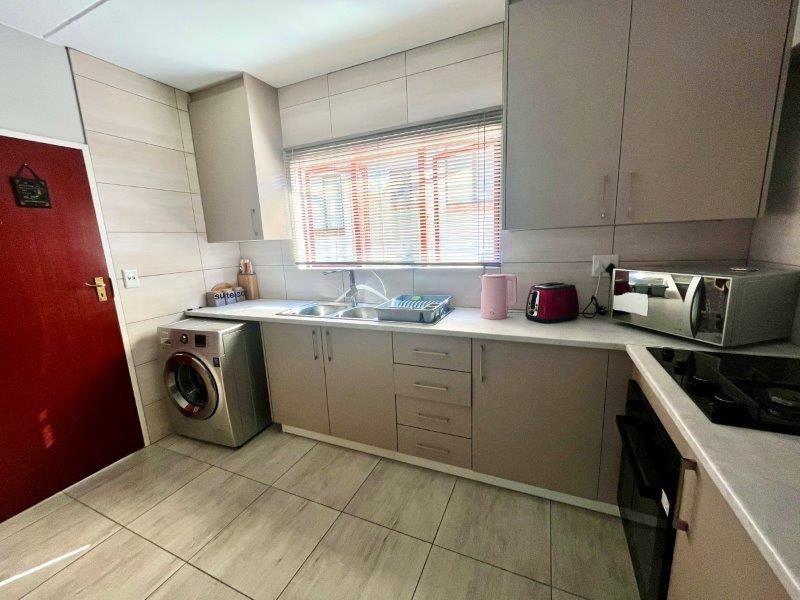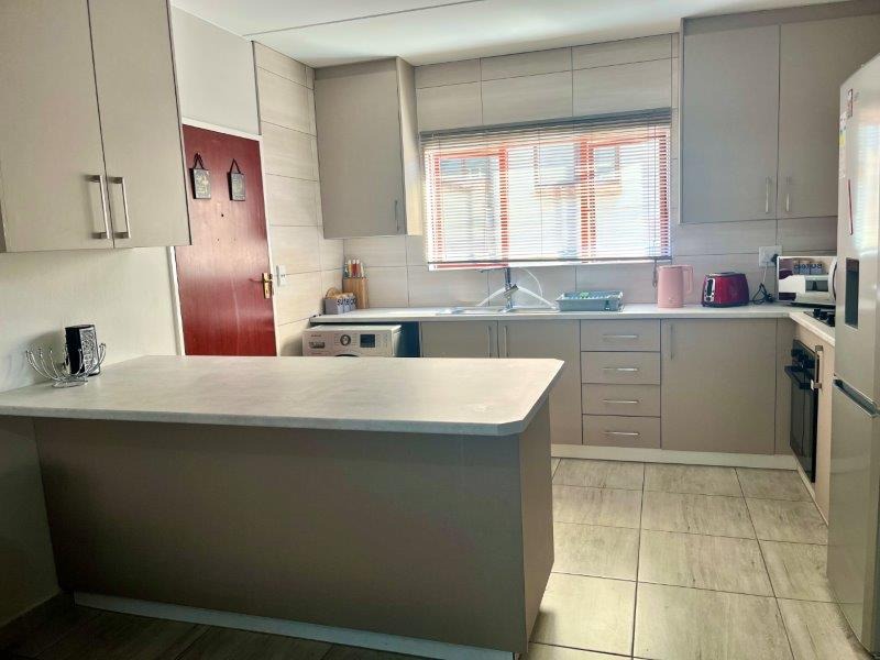 From the moment you enter, you’re greeted by bright, open-plan living areas complemented with sleek tiling and designed for both comfort and low-maintenance living. The stylish kitchen is a standout feature — complete with a modern layout, dual gas and electric stove plates , an electric under counter oven, generous cabinetry, and dedicated space for a washing machine and fridge. The breakfast counter flows naturally into the sunlit lounge and dining area, enhanced with a fitted TV stand and floating shelves for a clean, modern feel.