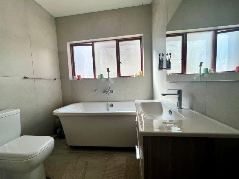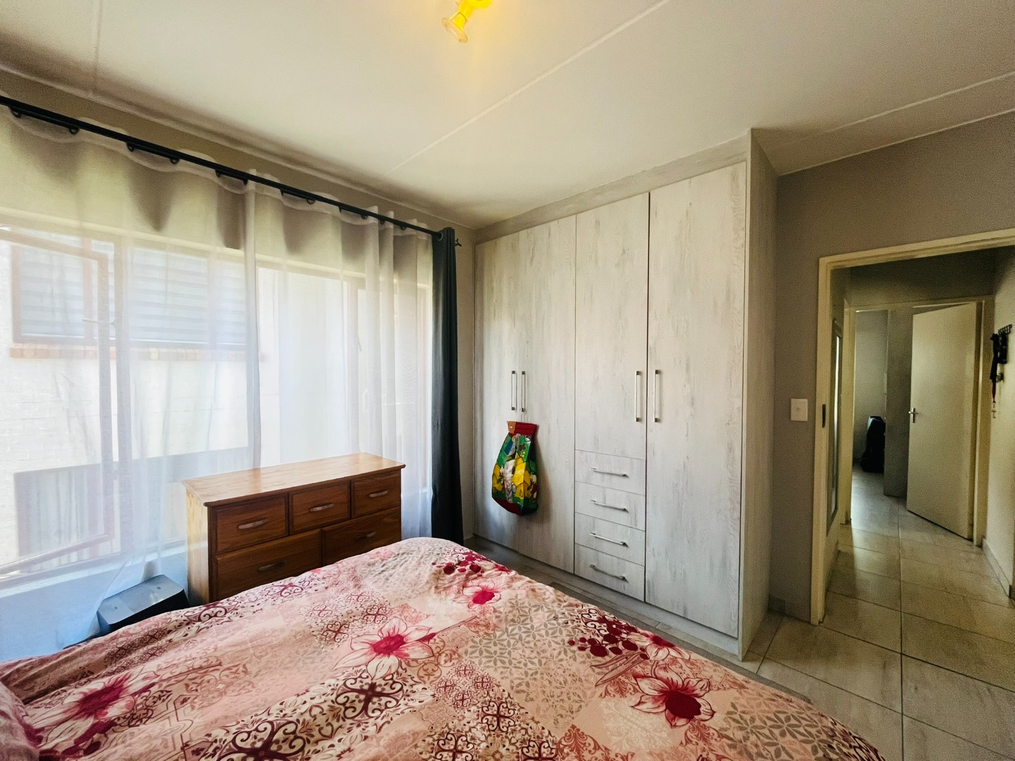 Large sliding doors lead you onto a covered patio that looks out over a private, fully walled small garden — a wonderful setting for quiet mornings, relaxed afternoons, or weekend braais in complete privacy.