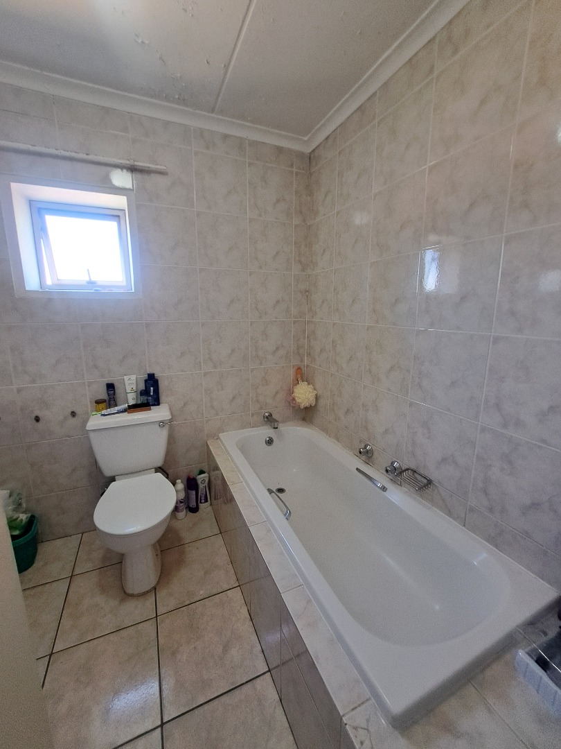The full bathroom is fully tiled, offering a clean and practical space with Botha shower and a bath – perfect for a relaxing soak after a long day. A window in the bathroom provides natural light and ventilation, adding to the fresh feel.