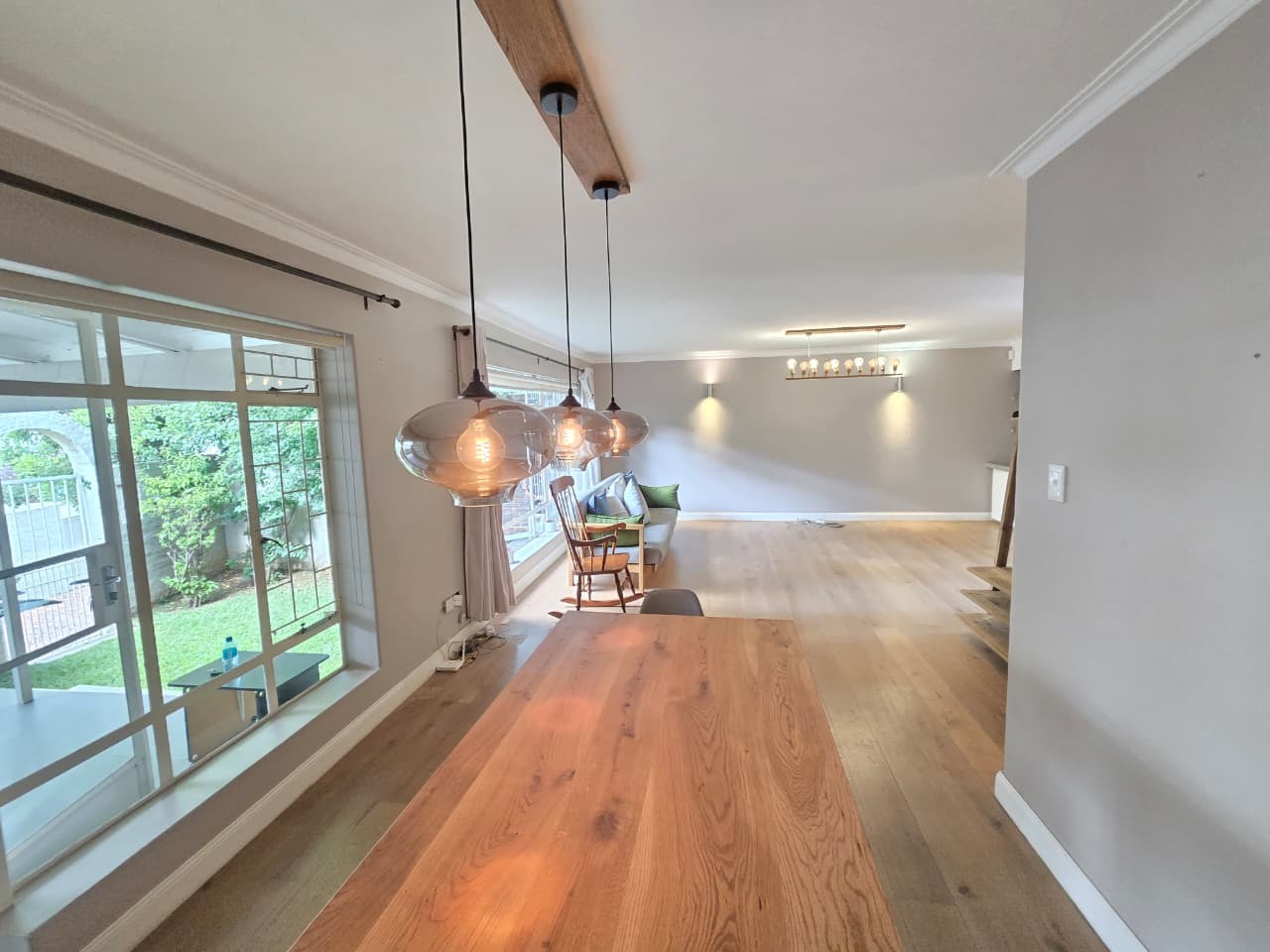 -Expansive lounge and dining area featuring wooden floors and excellent natural light