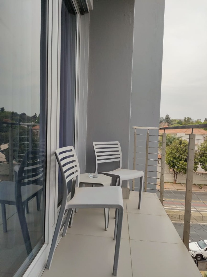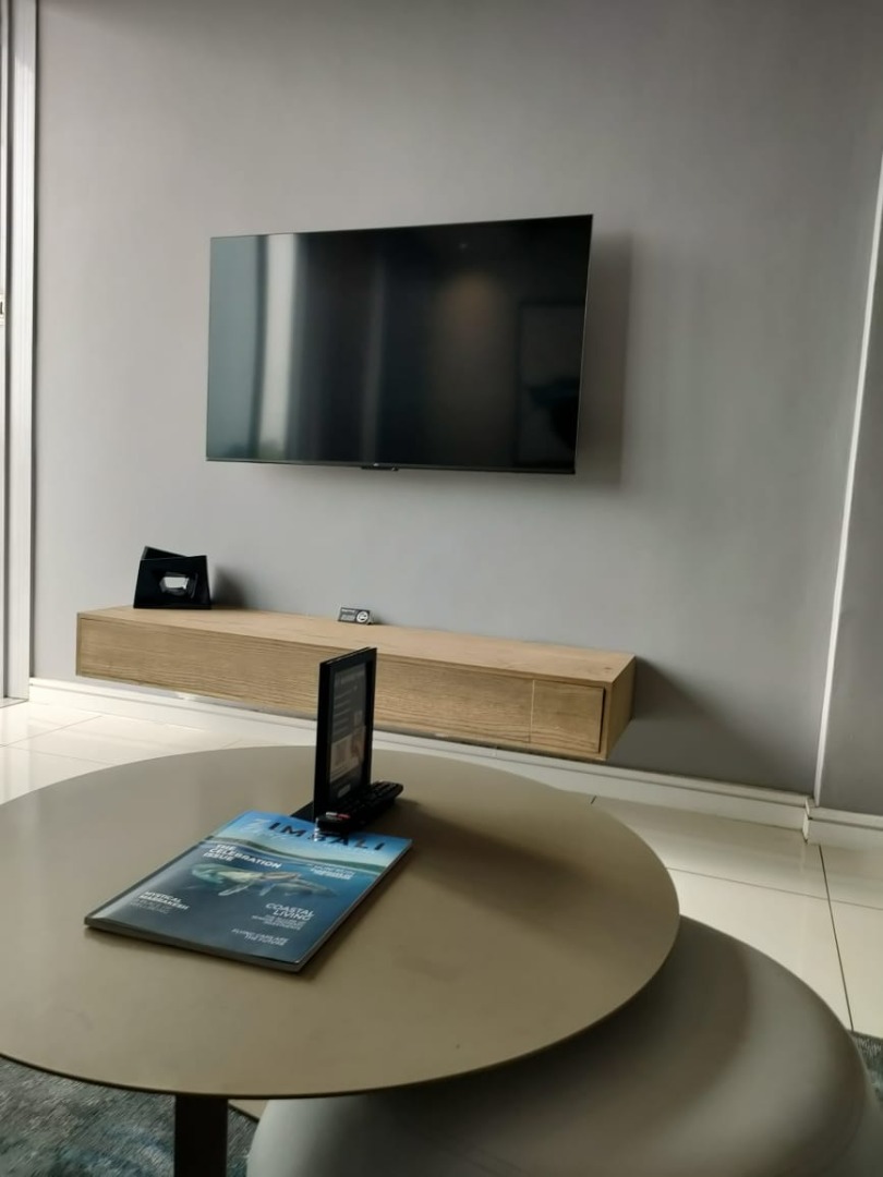 Living Area: Bright, open space with TV, sliding doors, and balcony views over Sandton’s skyline.