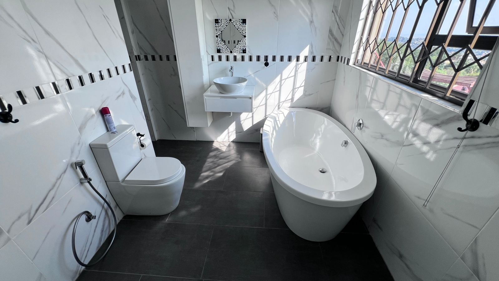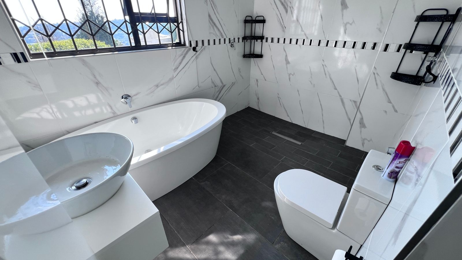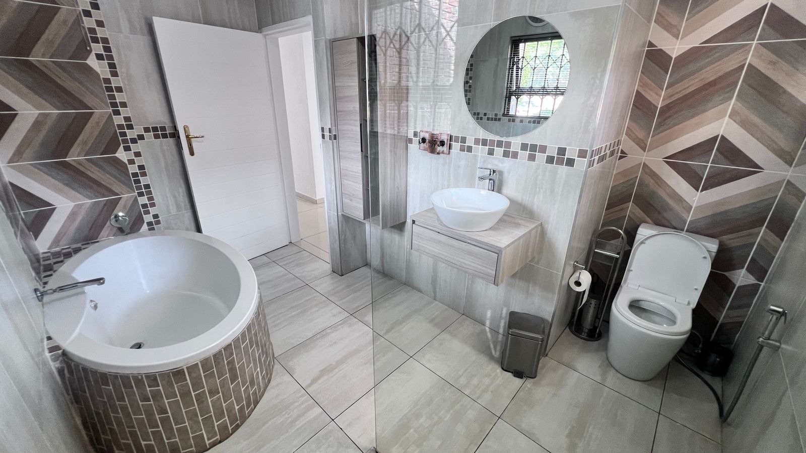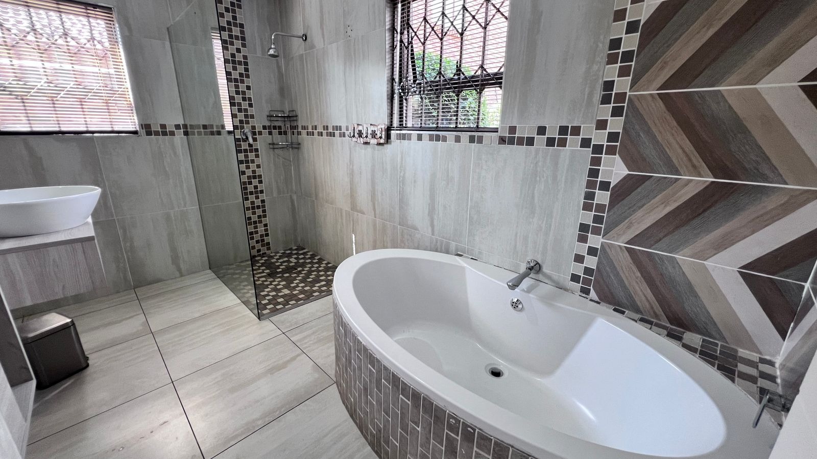 • Main bedroom (en-suite) with a walk-in cupboard and a luxurious full bathroom featuring a bathtub and double shower