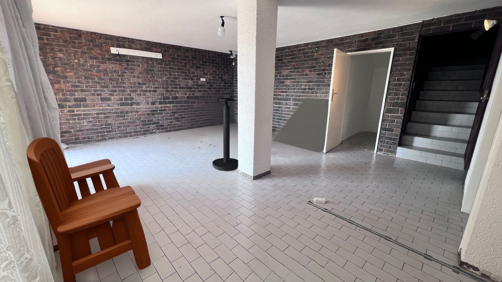 Stairs lead down to a spacious entertainment room, complete with: