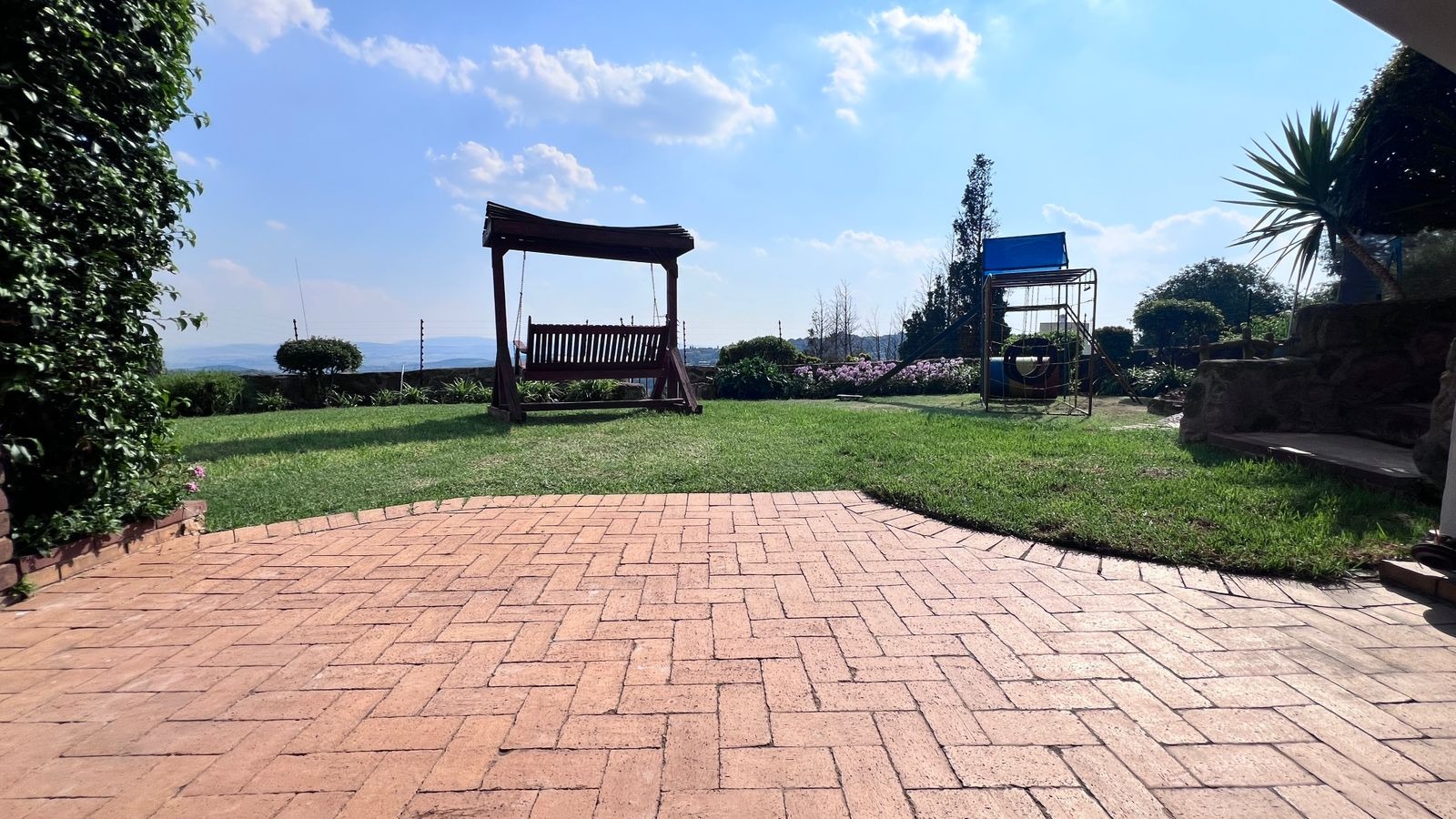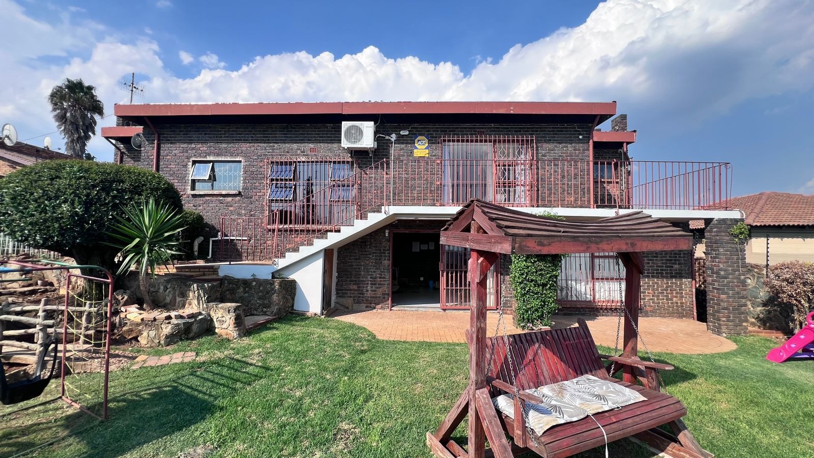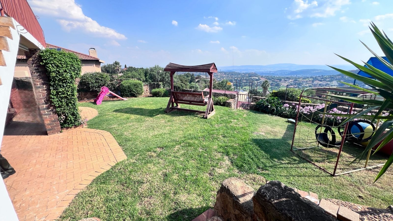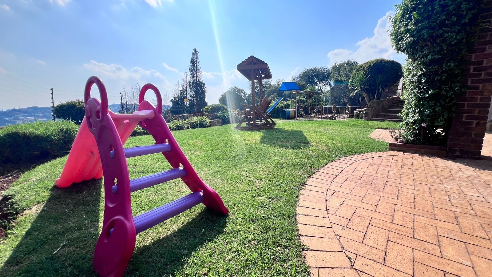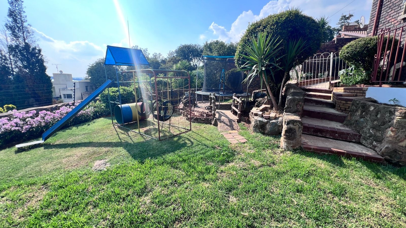 • Family-friendly garden features including a jungle gym, swing, and trampoline