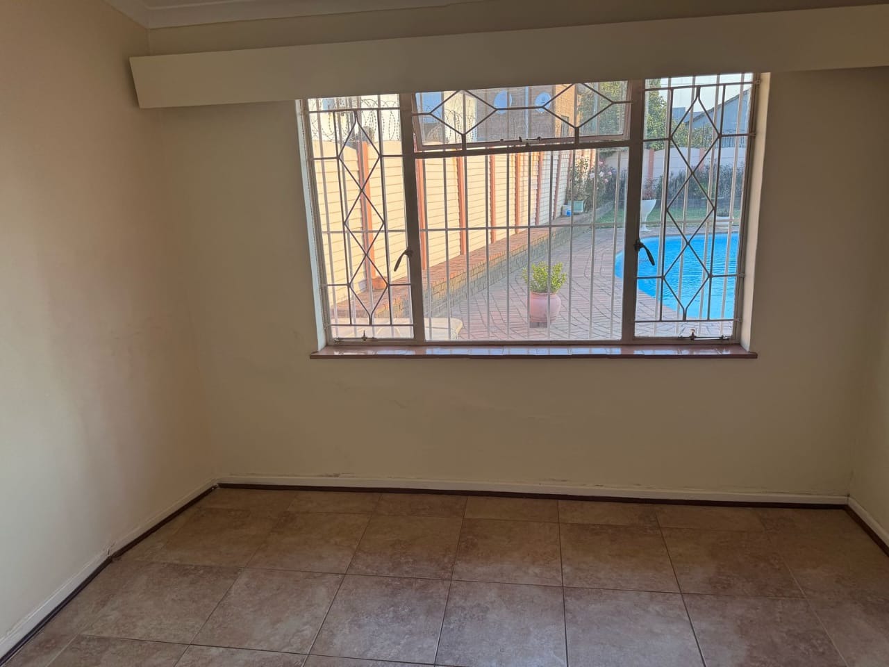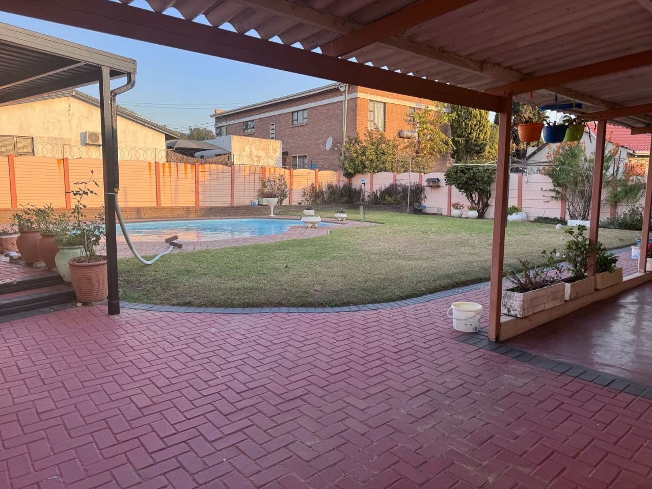 Outdoors, the property offers a sparkling swimming pool and a secure yard, ideal for family gatherings and leisure.