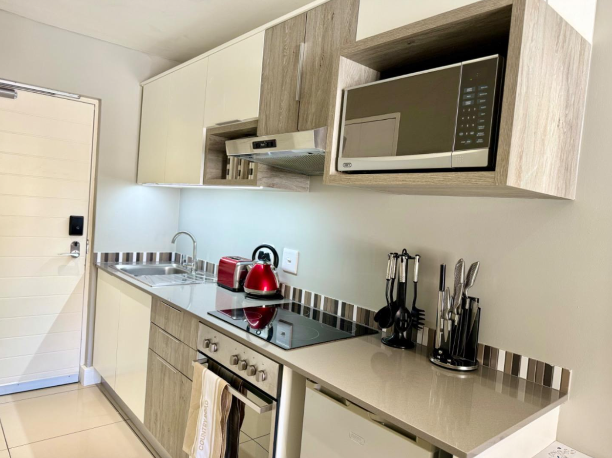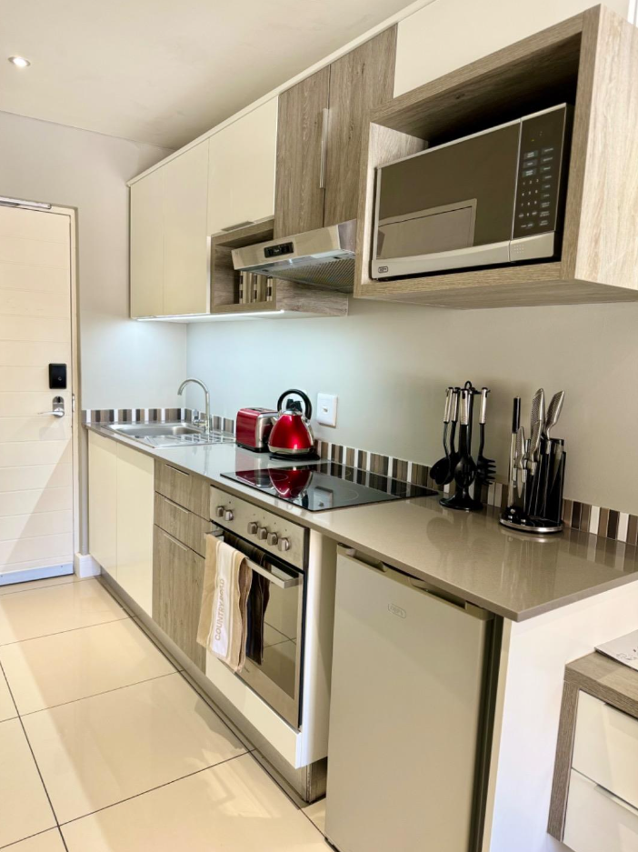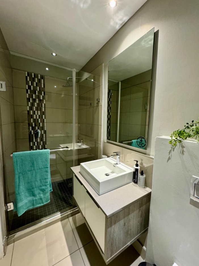 This contemporary studio apartment offers a sophisticated urban living experience in the vibrant Rosebank precinct of Johannesburg. Designed specifically for modern convenience, the unit presents a sleek, compact kitchen equipped with integrated appliances, including an oven, hob, microwave, and extractor fan. This culinary space is beautifully complemented by stylish two-tone cabinetry and focused under-cabinet lighting. The well-appointed bathroom boasts a luxurious glass-enclosed shower, a chic vessel sink, and a wall-mounted toilet, all expertly finished with modern fixtures and recessed lighting to create a clean aesthetic. Residents can also enjoy a valuable piece of private outdoor space on their personal balcony, which is perfect for quiet relaxation and fresh air.