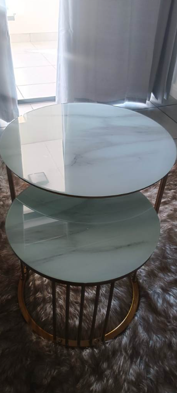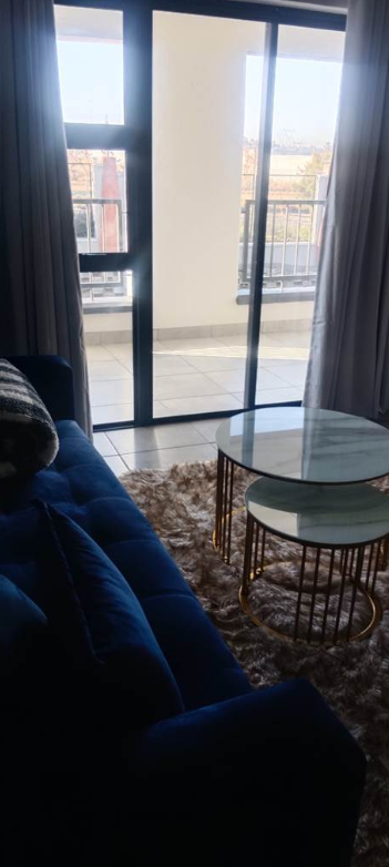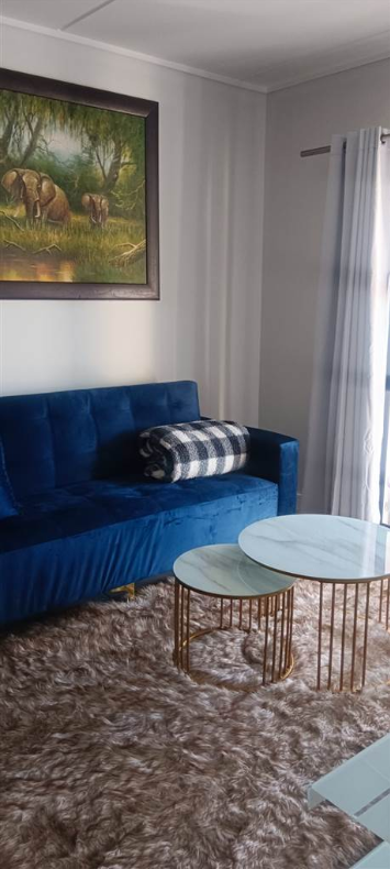 The living space is adorned with a luxurious blue velvet sofa, elegant nesting coffee tables, and a plush rug, extending to a private, tiled balcony that offers a scenic view and abundant natural light. This property is ideally suited for discerning professionals or individuals seeking a lock-up-and-go lifestyle without compromising on comfort or style. As a fully furnished unit, it provides 1 December occupancy with high-quality, modern decor throughout, including a vibrant blue upholstered bed in the bedroom.