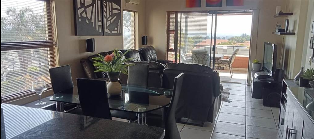 The modern kitchen stands out with its sleek dark wood cabinetry, durable granite countertops, and high-quality stainless steel appliances, complemented by a practical breakfast bar. Adjacent to the kitchen, the spacious lounge, complete with elegant tiled flooring, extends onto a private, covered balcony. This outdoor space offers expansive panoramic views of the lush, green landscape, presenting an ideal setting for relaxation or sophisticated entertaining. The apartment features two well-appointed bedrooms, one of which is en-suite, providing superior privacy and comfort. Both bedrooms include practical built-in wardrobes, offering ample storage space.
