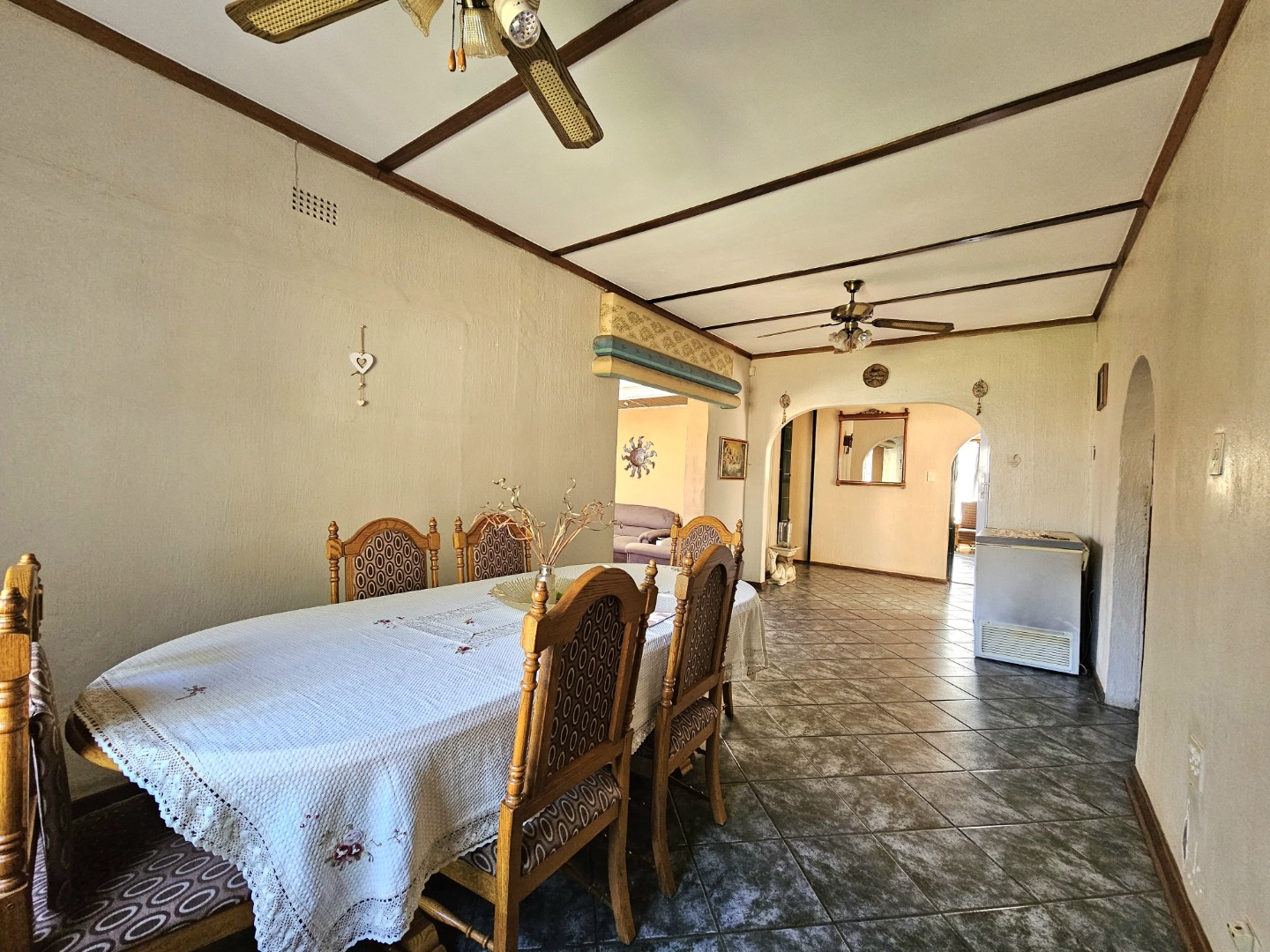 A welcoming entrance leads into a spacious lounge and a separate dining room, ideal for family gatherings. The fully fitted kitchen provides ample cupboard space and is well-positioned to serve both the indoor living areas and outdoor entertainment zone.